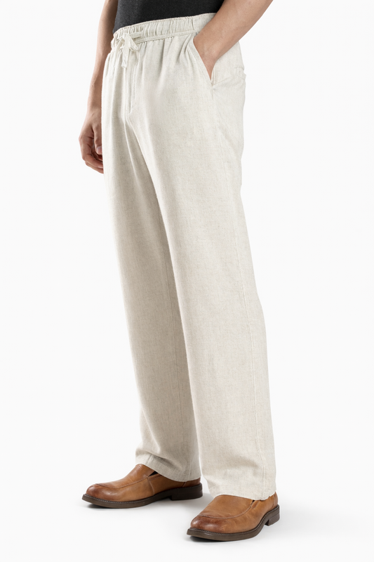 The Classic Linen Pants, designed for ultimate comfort and effortless sophistication. Made from breathable linen in a classic white tone, these relaxed-fit pants feature an adjustable drawstring waist for a perfect fit.
