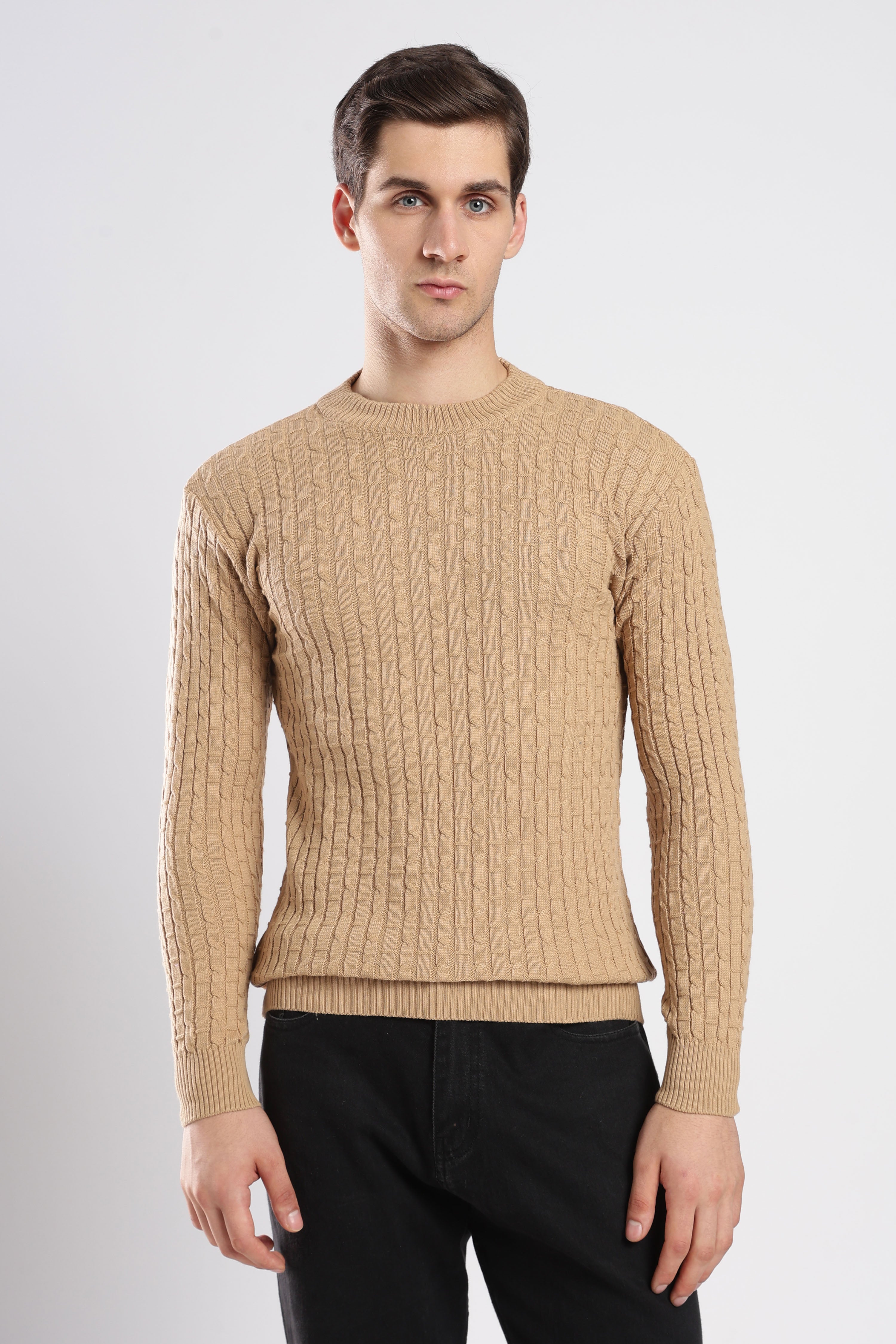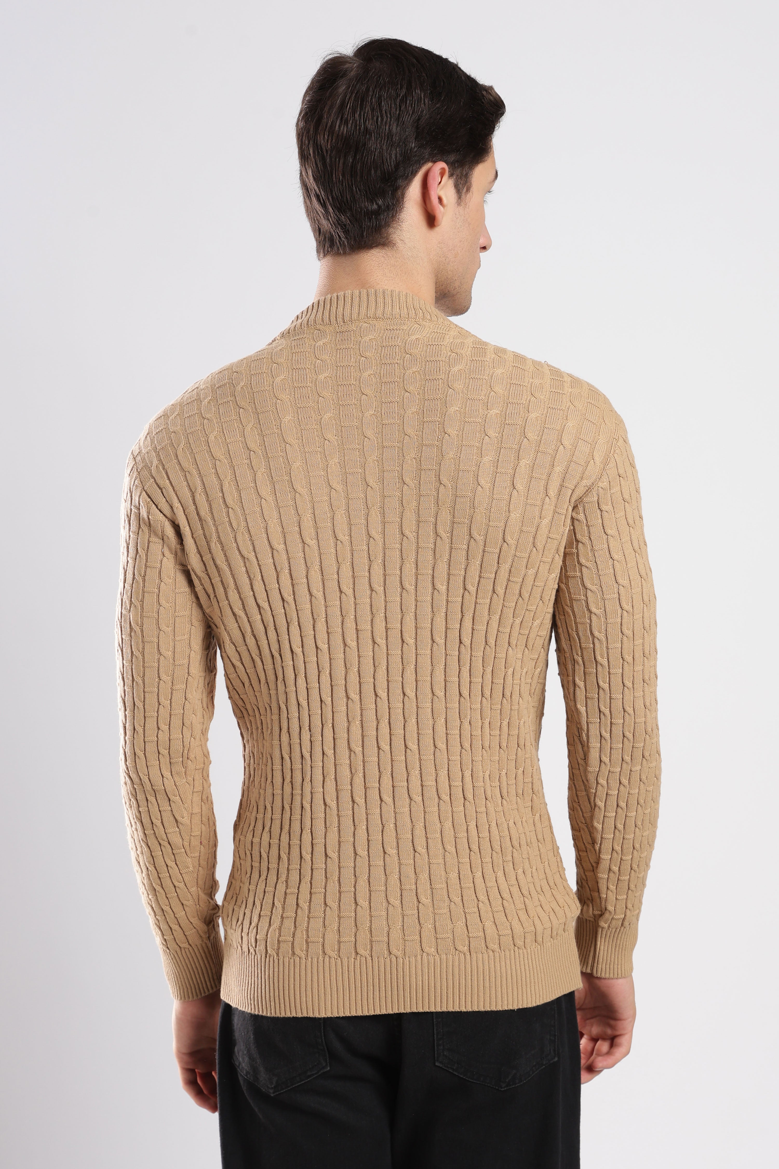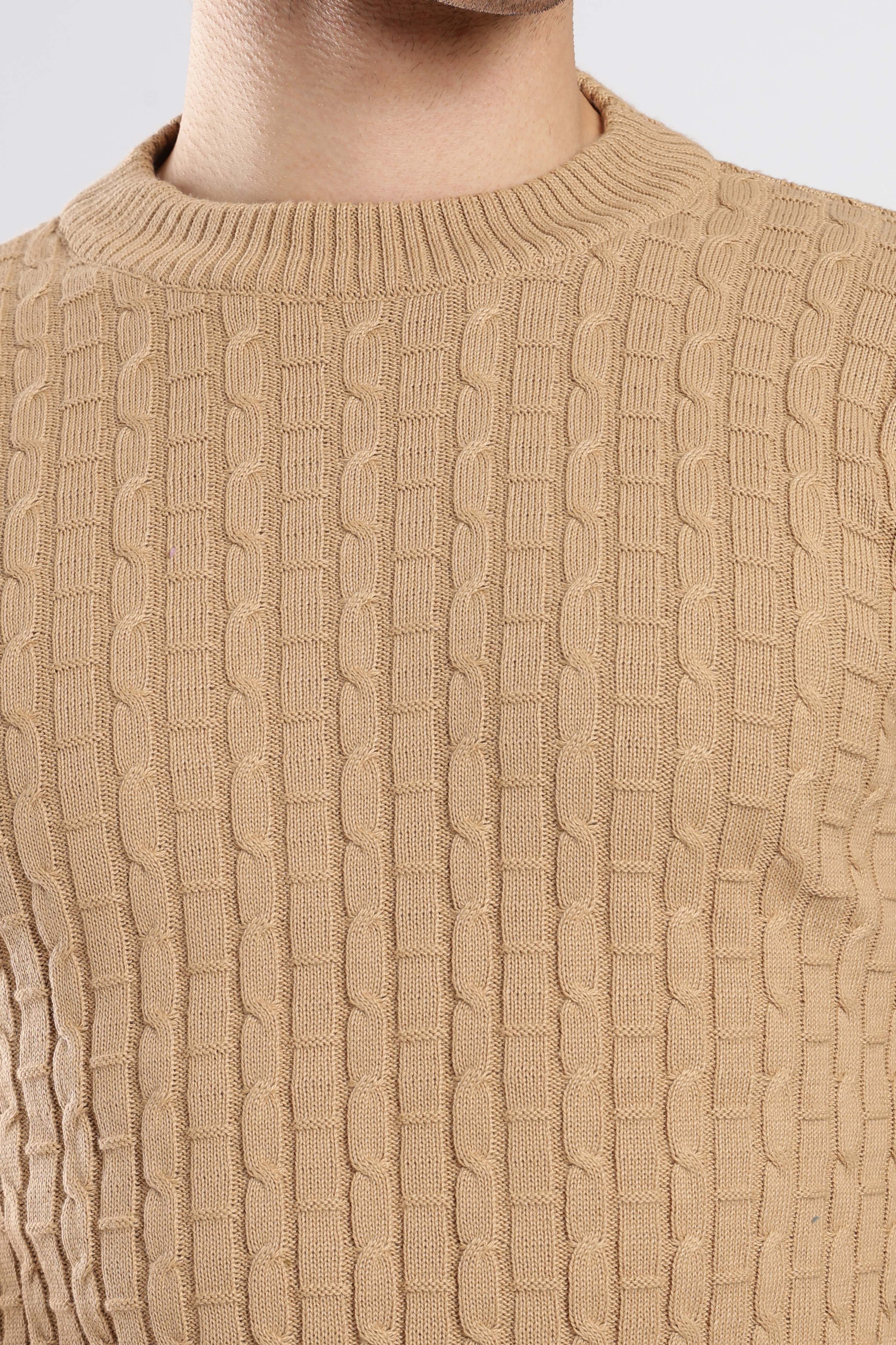 Textured Beige cable knit sweatshirt with a sophisticated knit design. Effortlessly stylish and comfortable for any occasion.