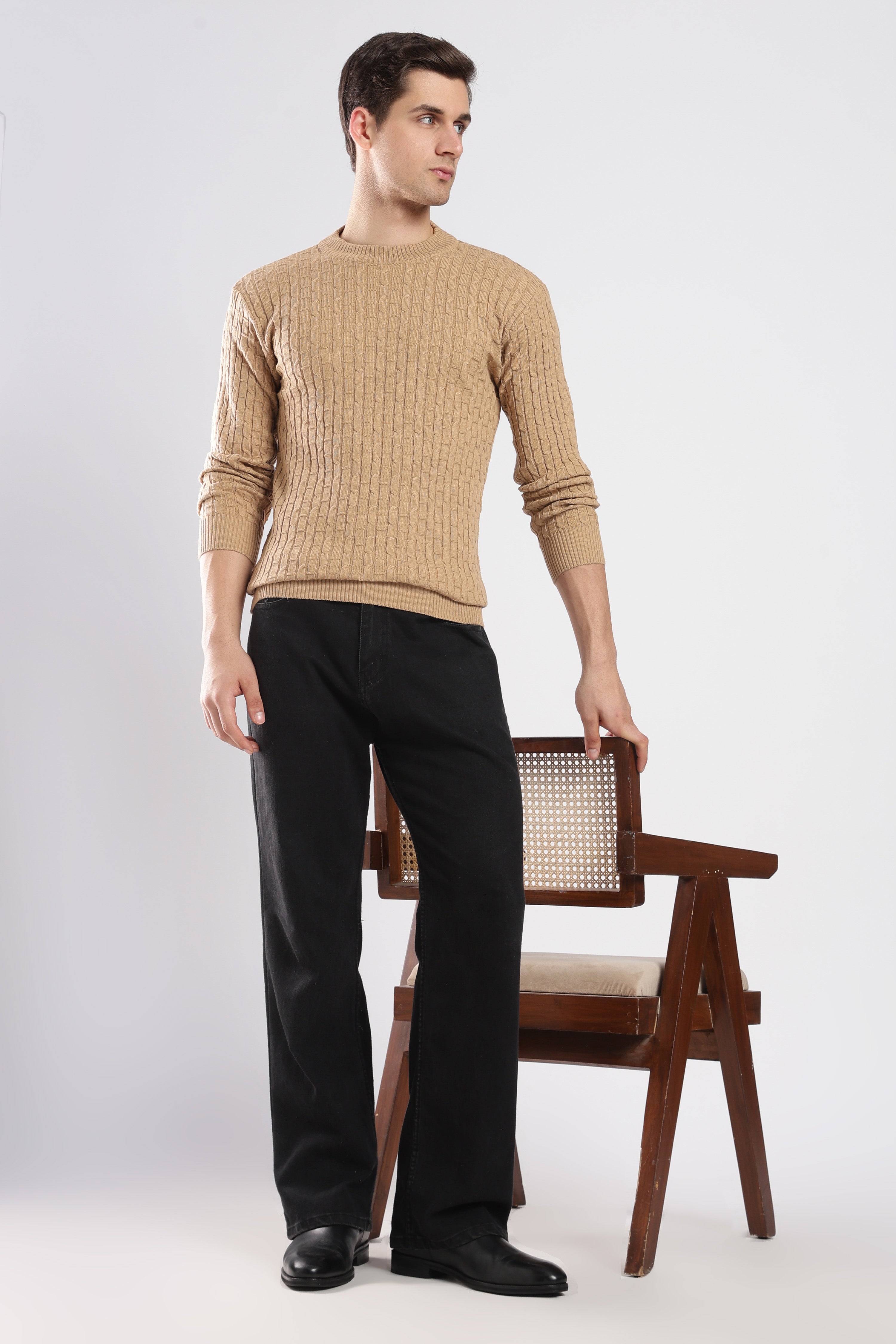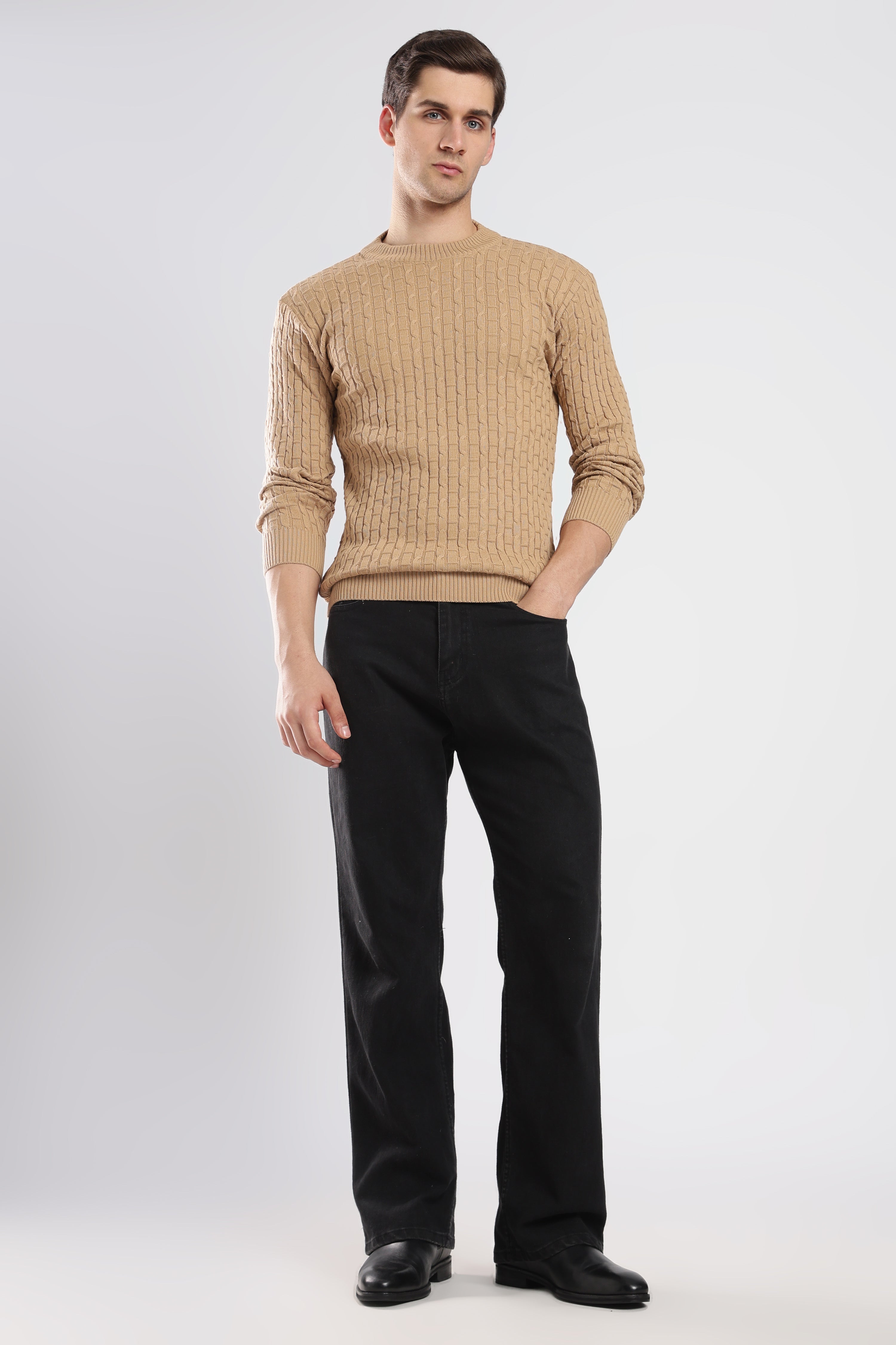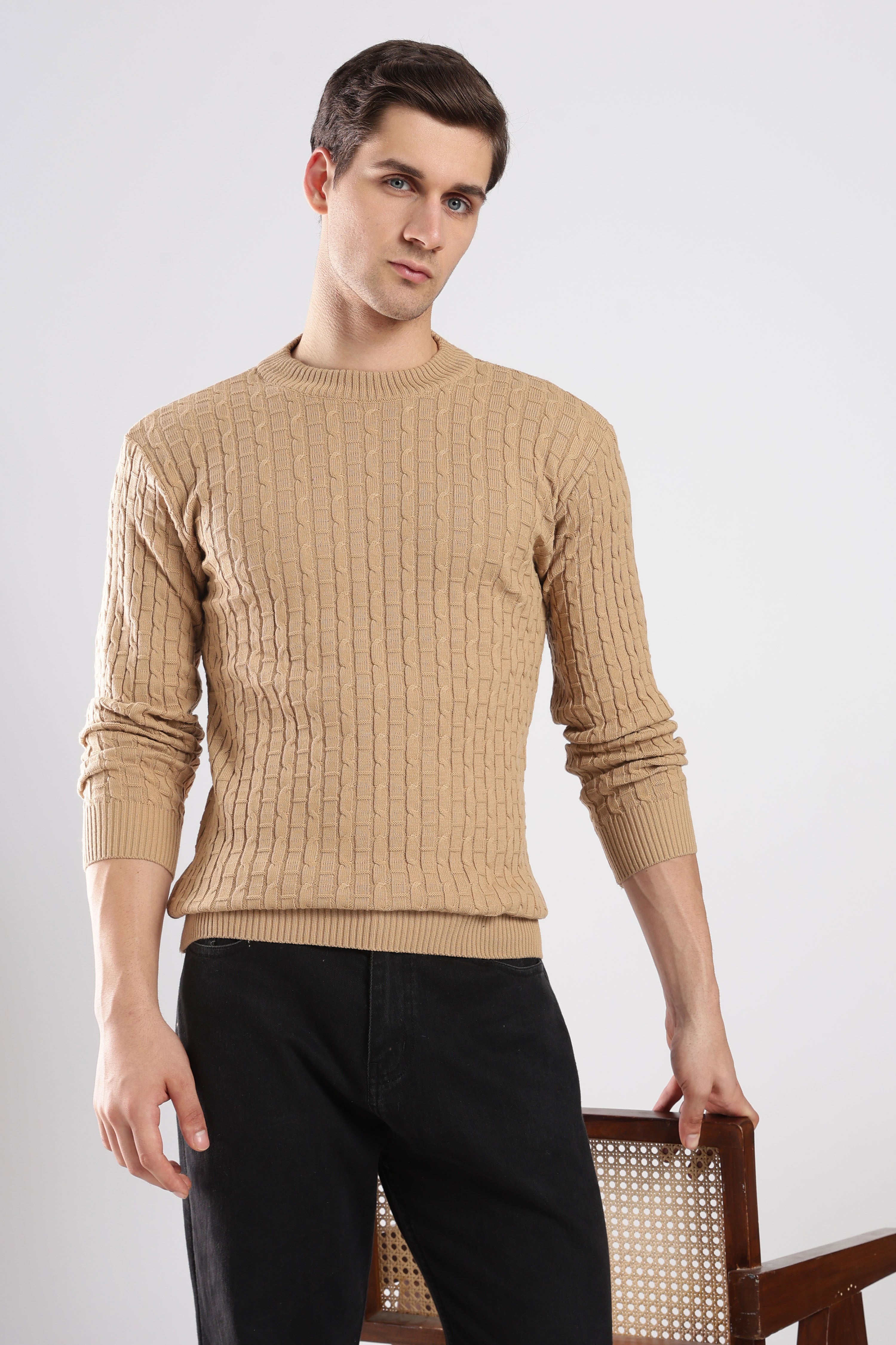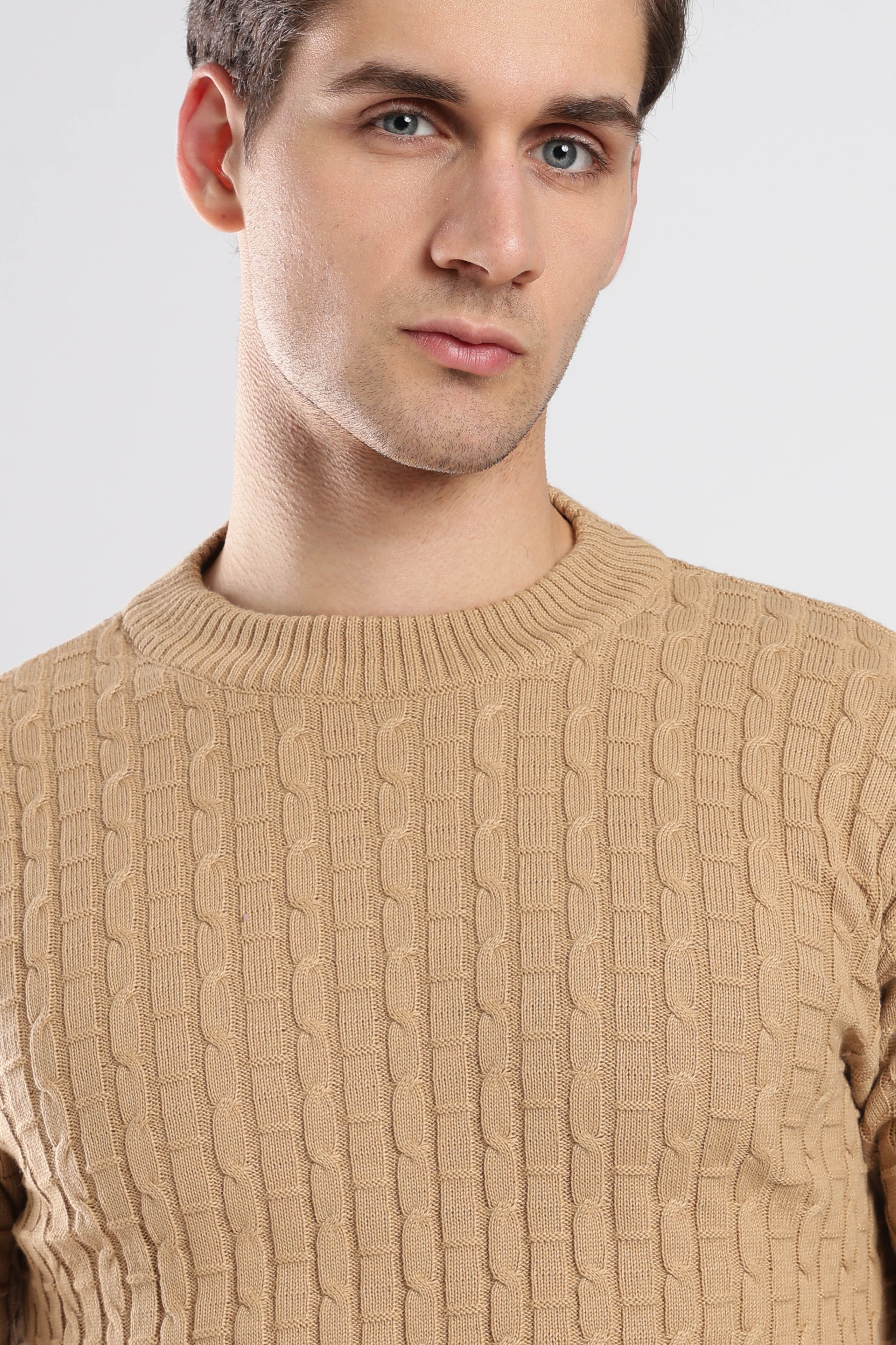 Textured Beige cable knit sweatshirt with a sophisticated knit design. Effortlessly stylish and comfortable for any occasion.