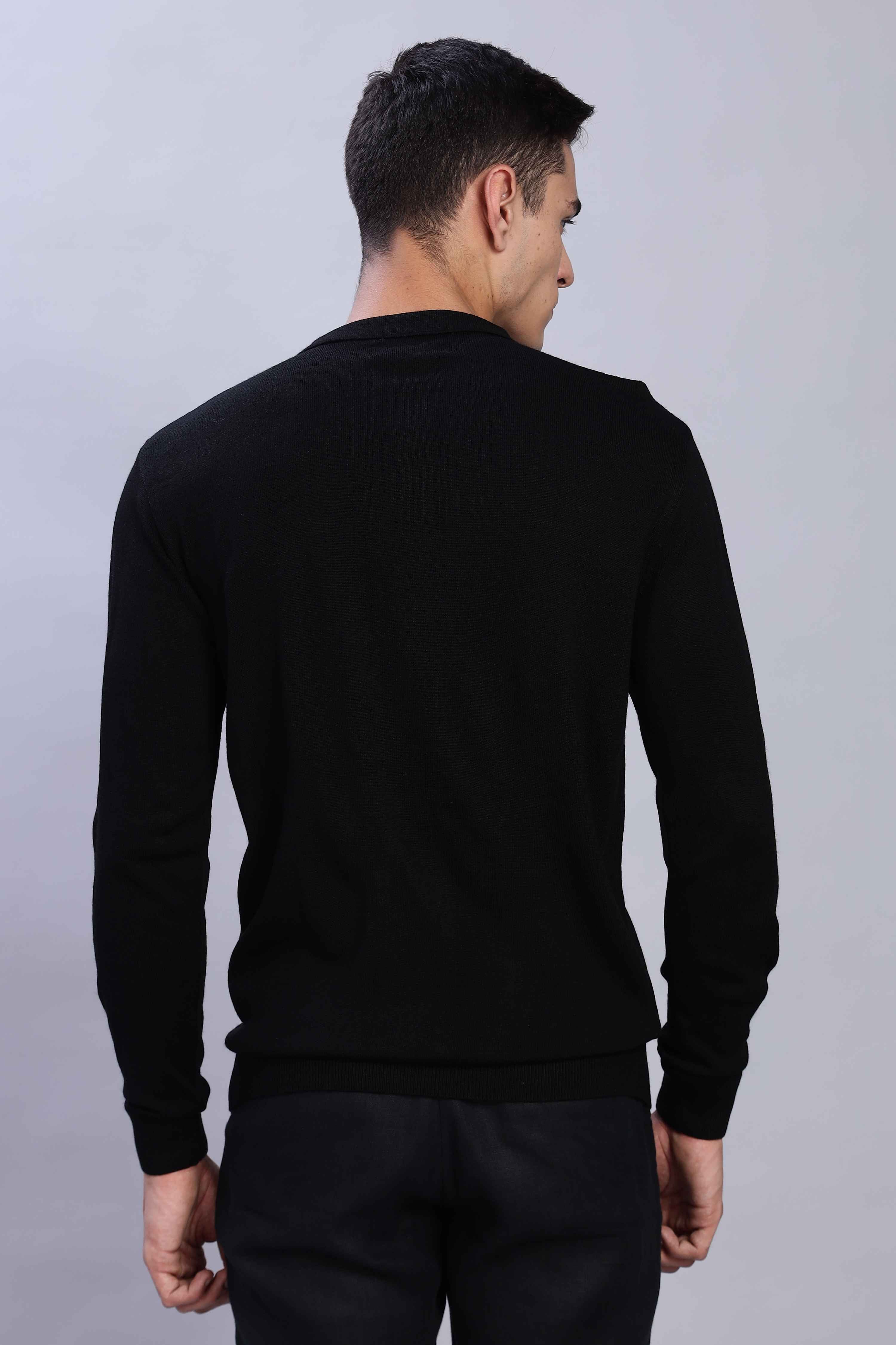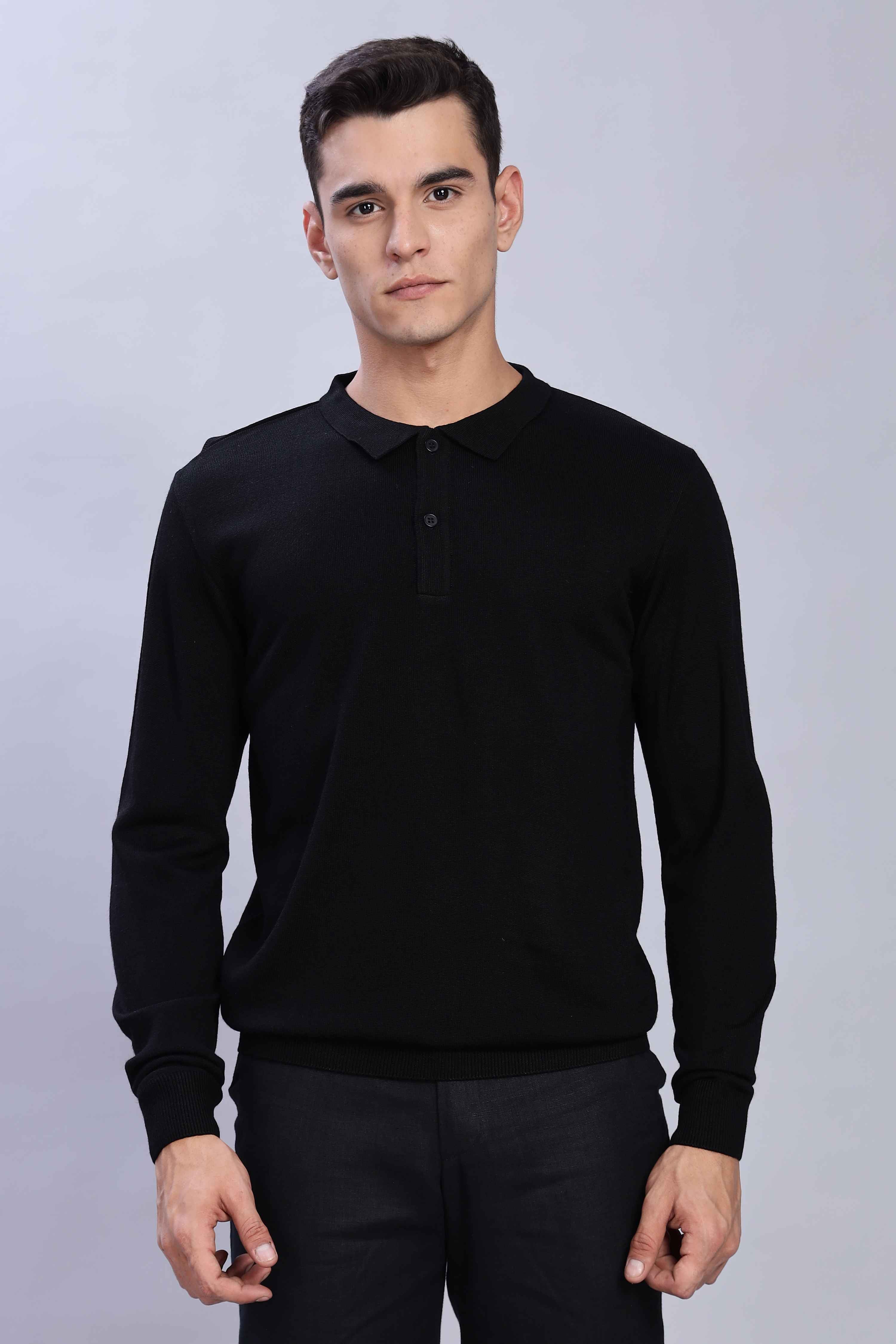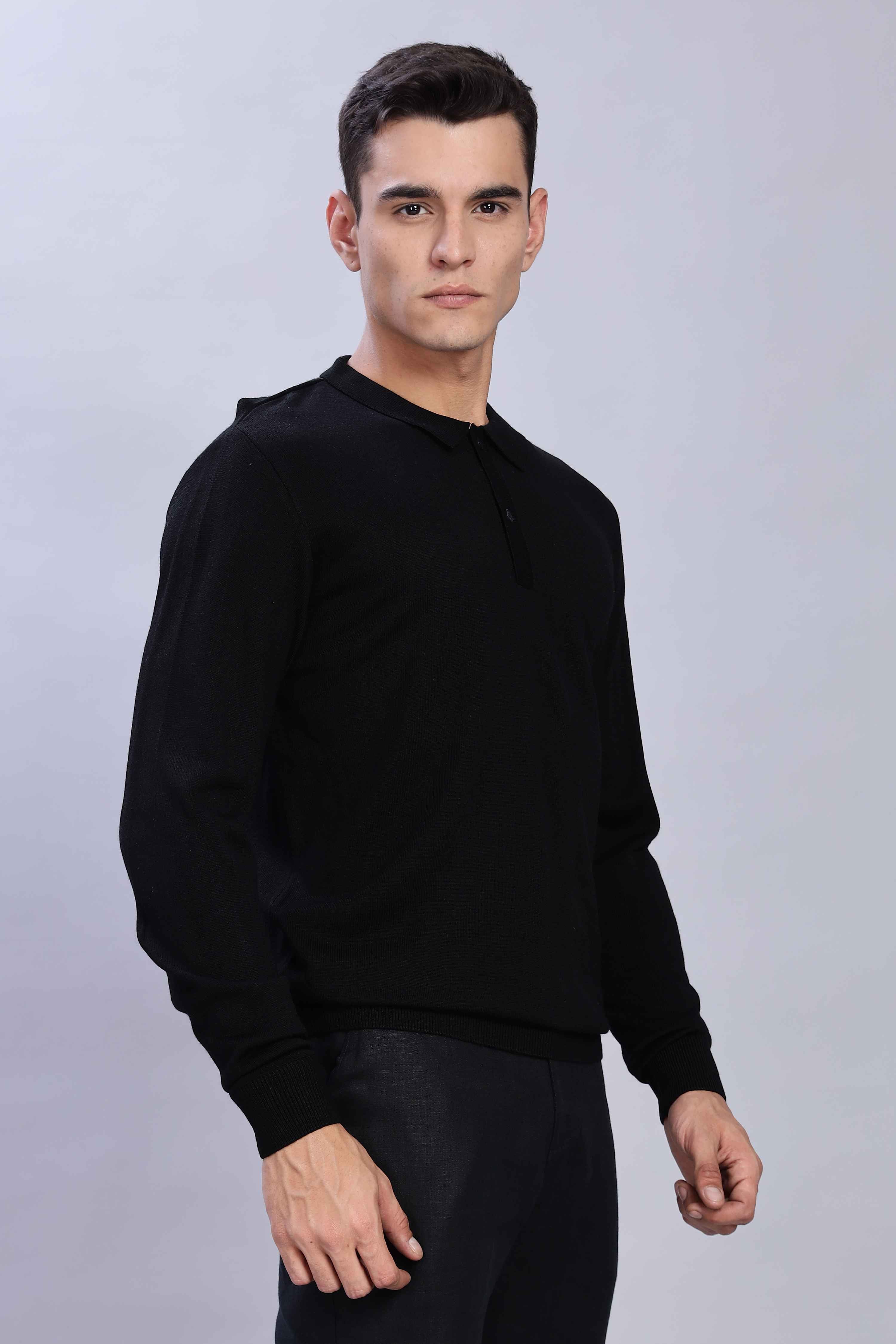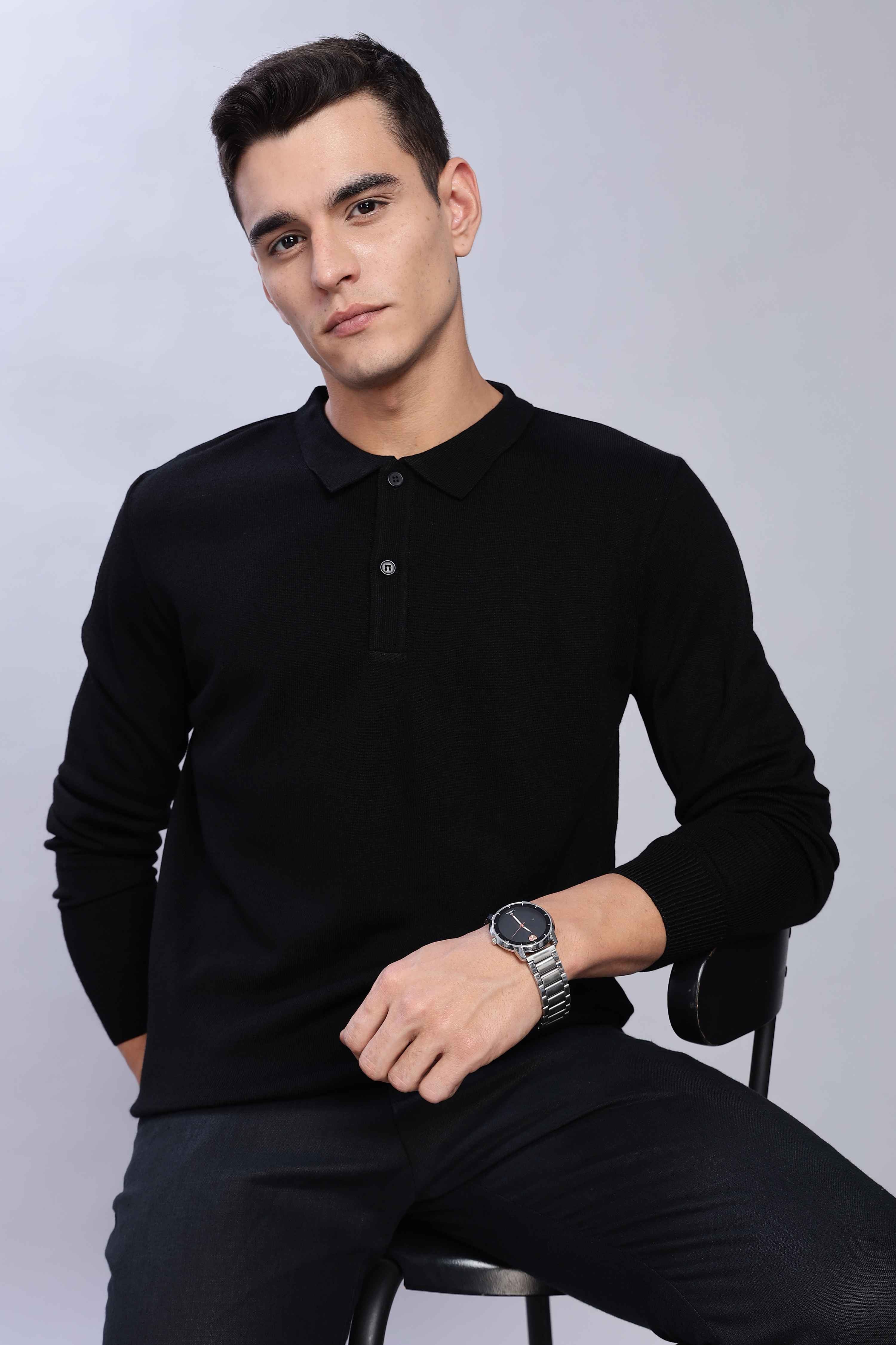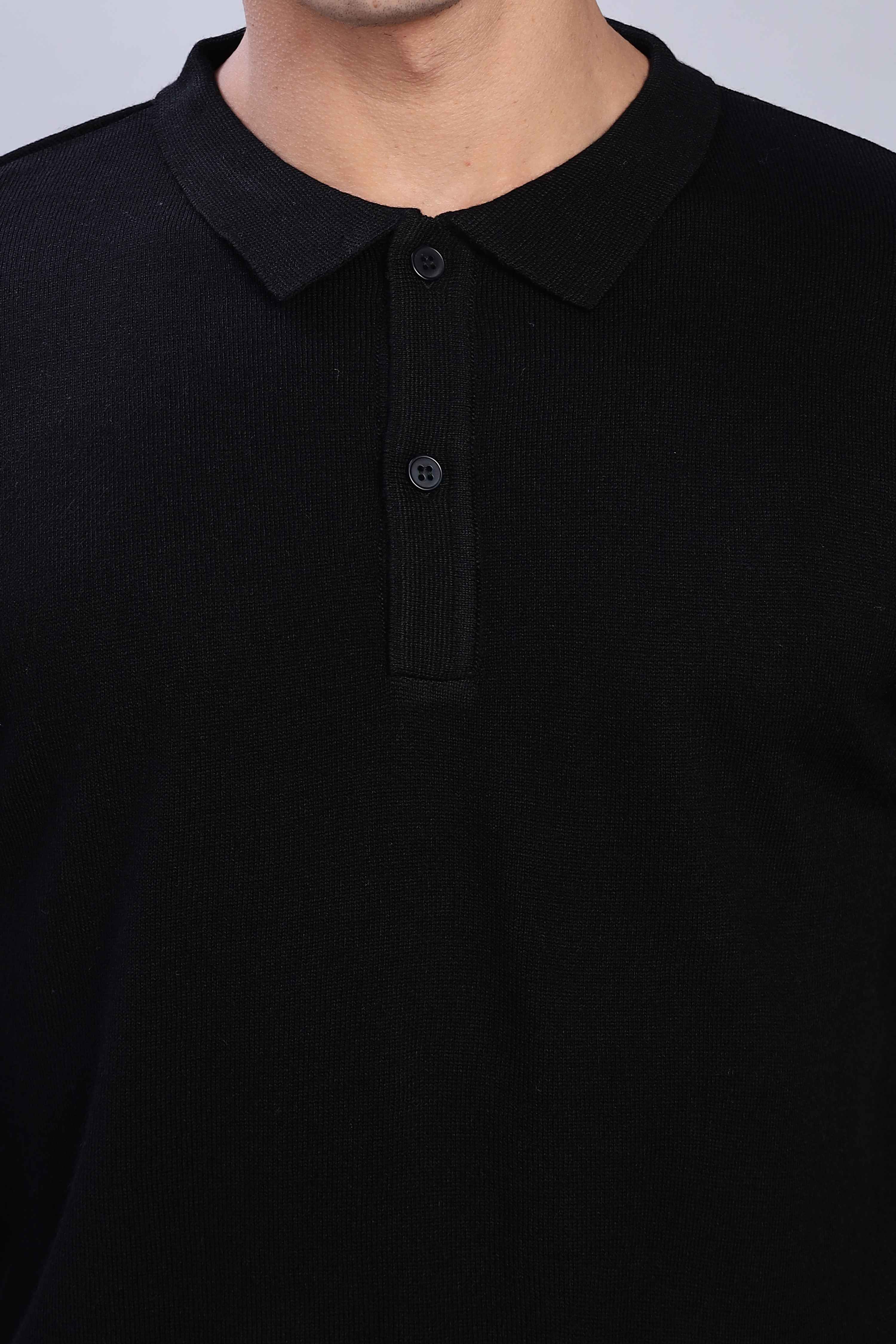 Crafted from a premium fine-knit fabric that offers both comfort and sophistication. Featuring a rich black, a classic polo collar, and a sleek two-button placket, this versatile piece is perfect for layering or wearing solo