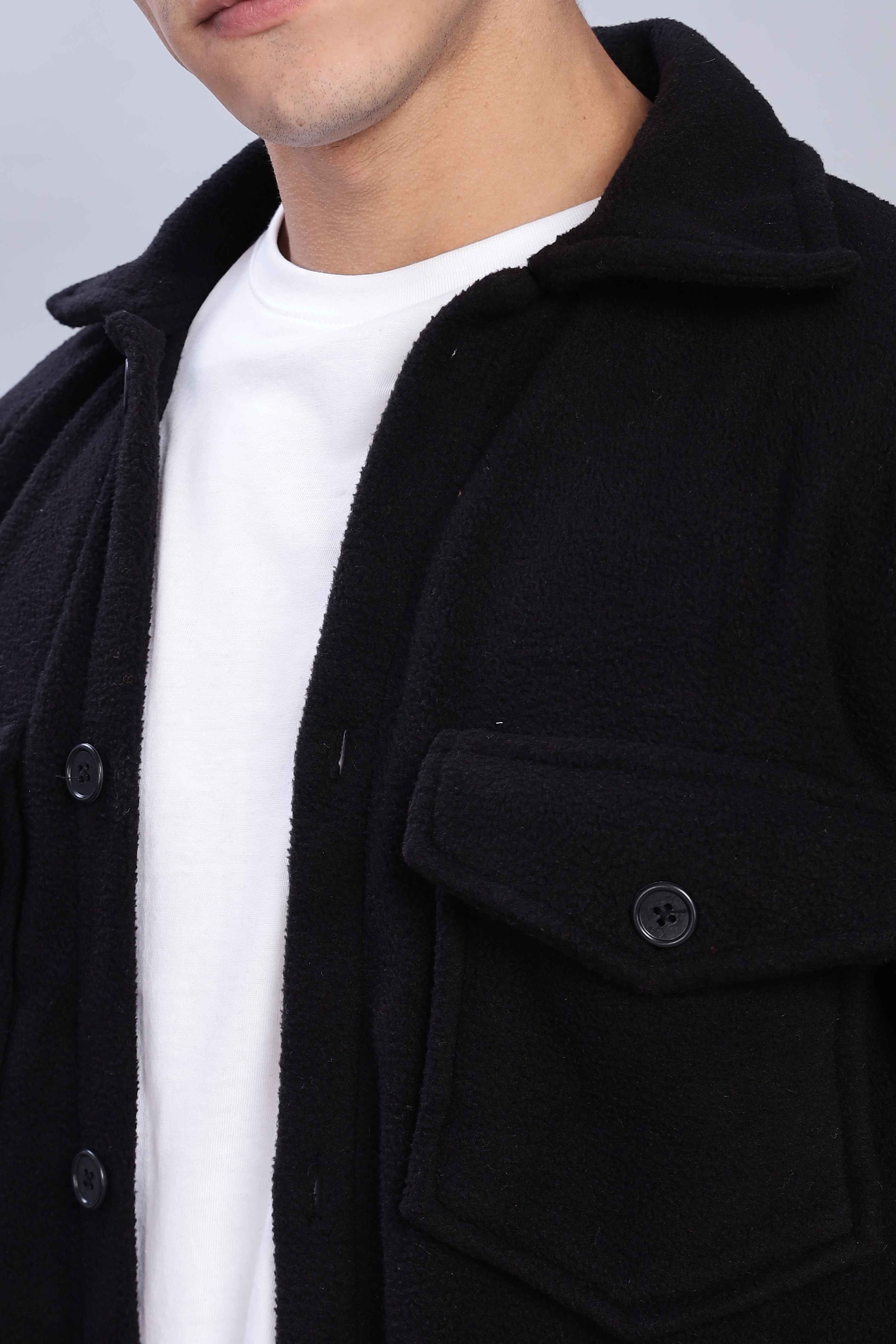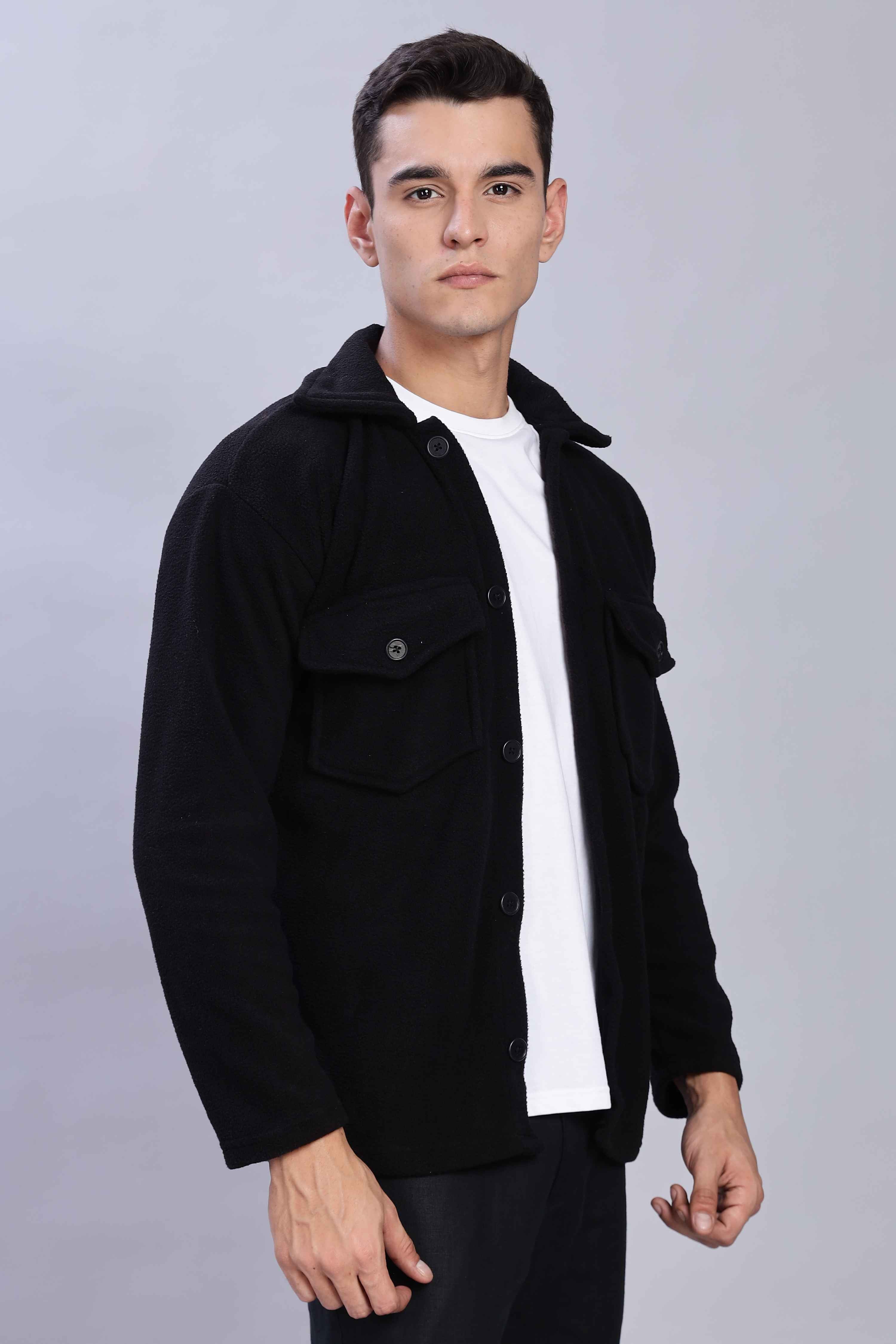 Crafted from versatile fabric, this black overshirt offers a perfect balance of structure and comfort. Featuring a button-up closure, utility chest pockets, and a sharp collar, it layers effortlessly over any outfit.