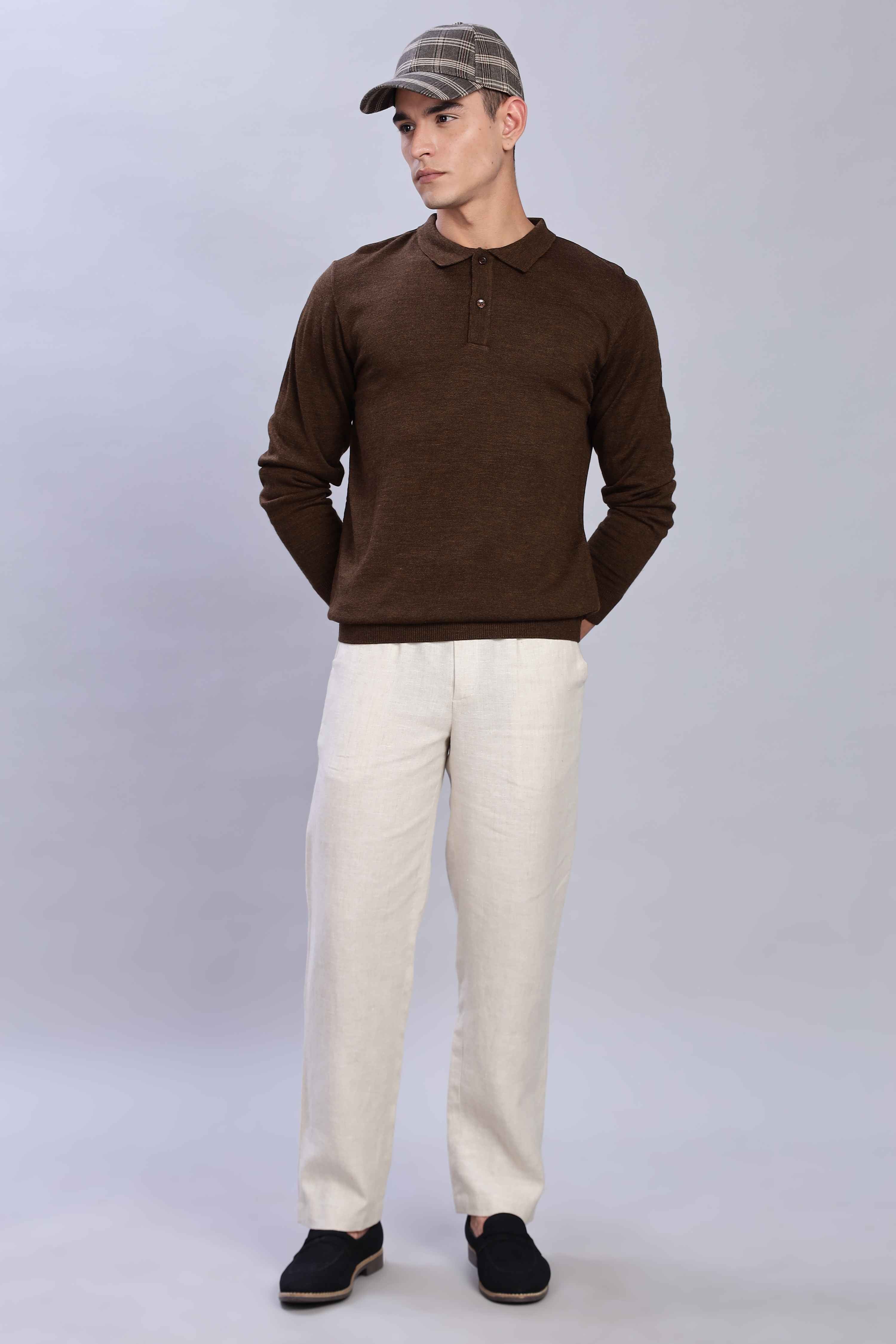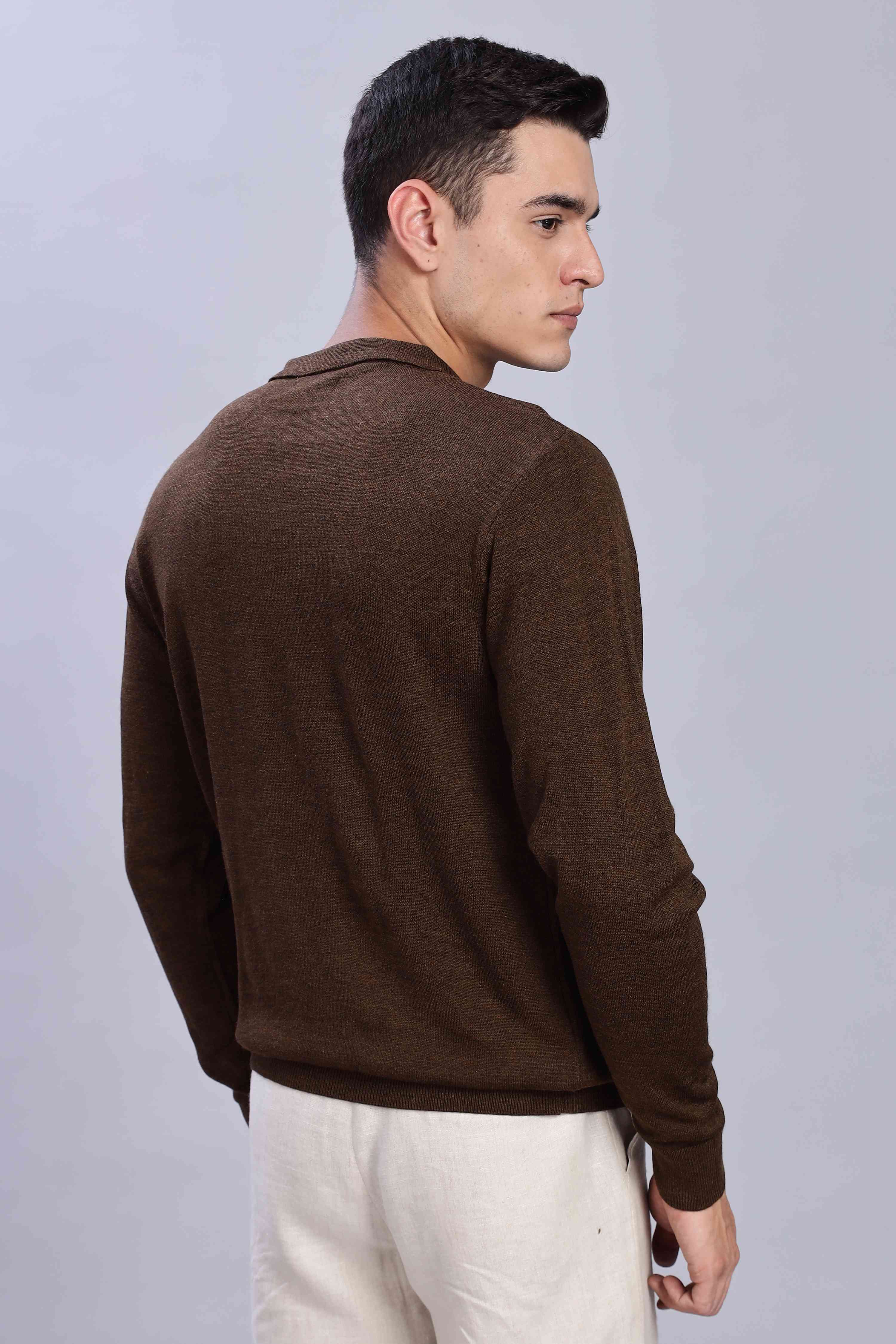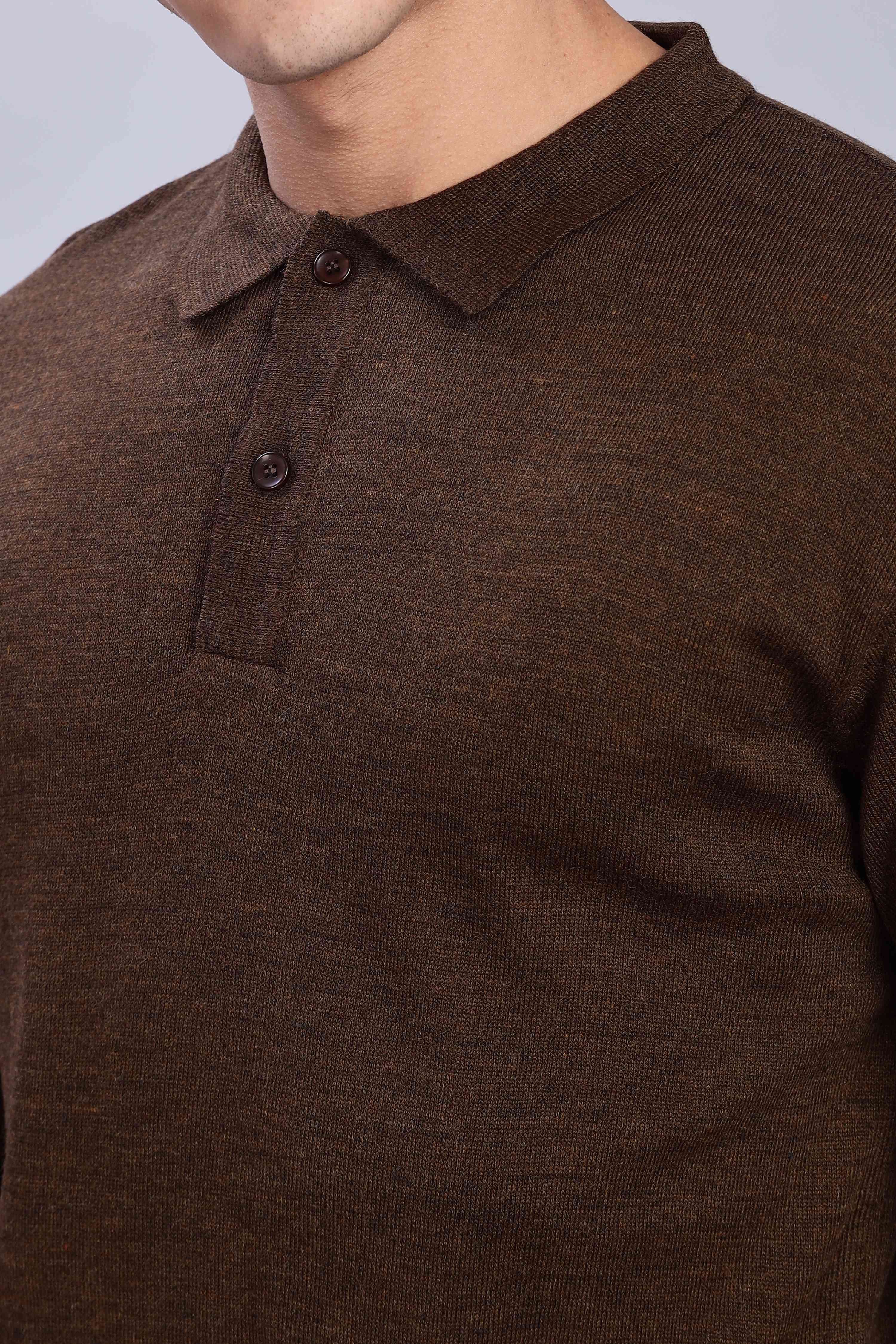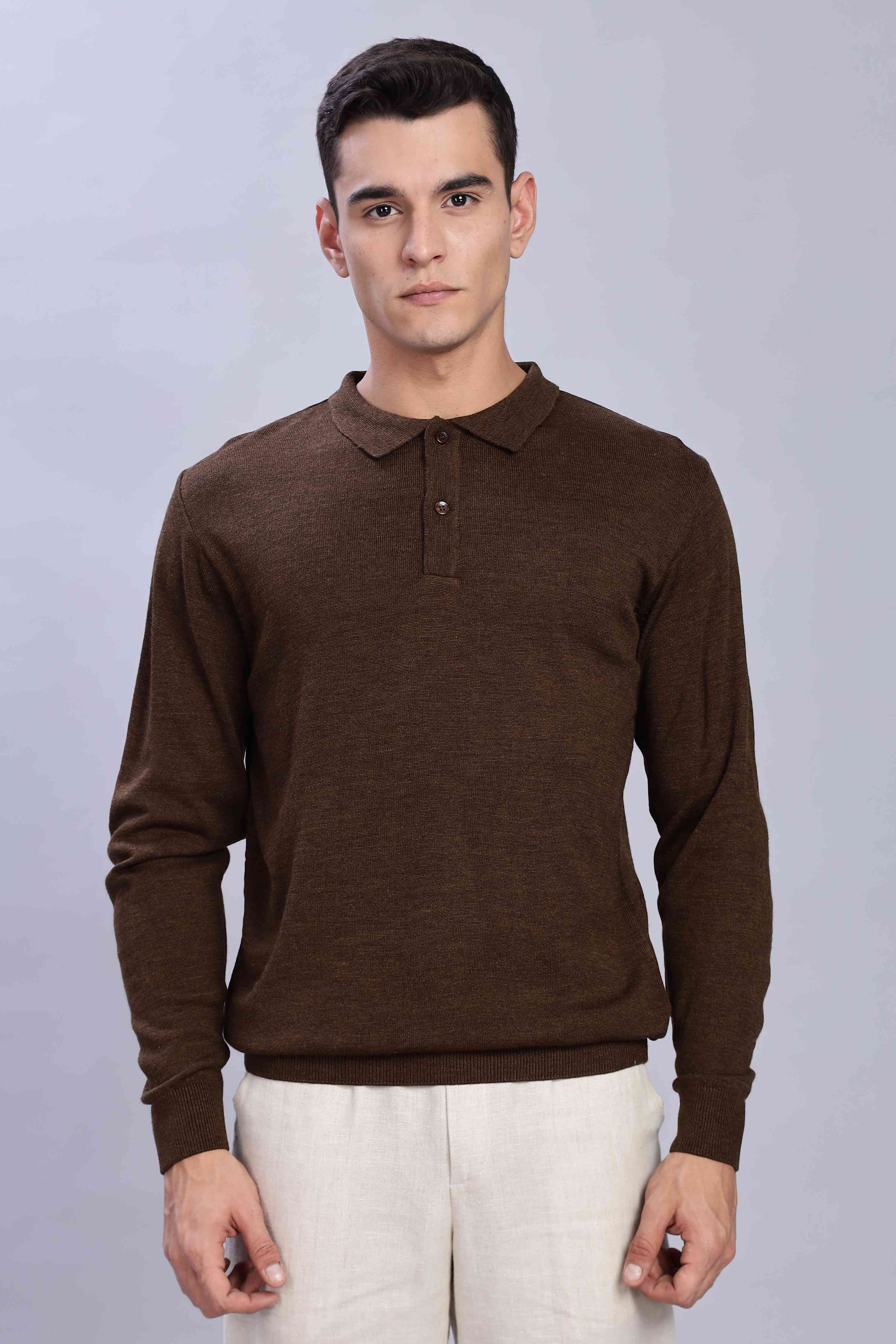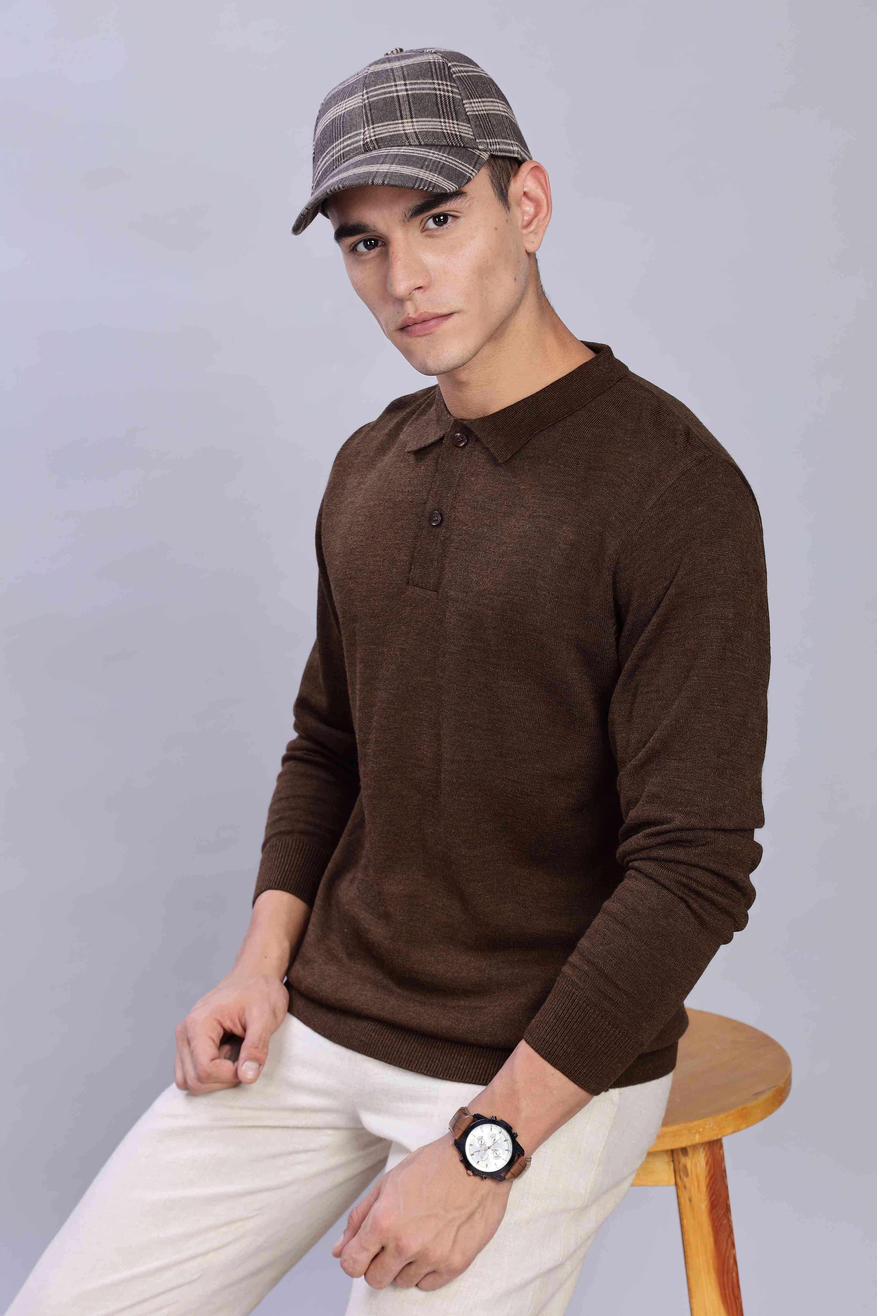 Crafted from a premium fine-knit fabric that offers both comfort and sophistication. Featuring a rich brown hue, a classic polo collar, and a sleek two-button placket, this versatile piece is perfect for layering or wearing solo