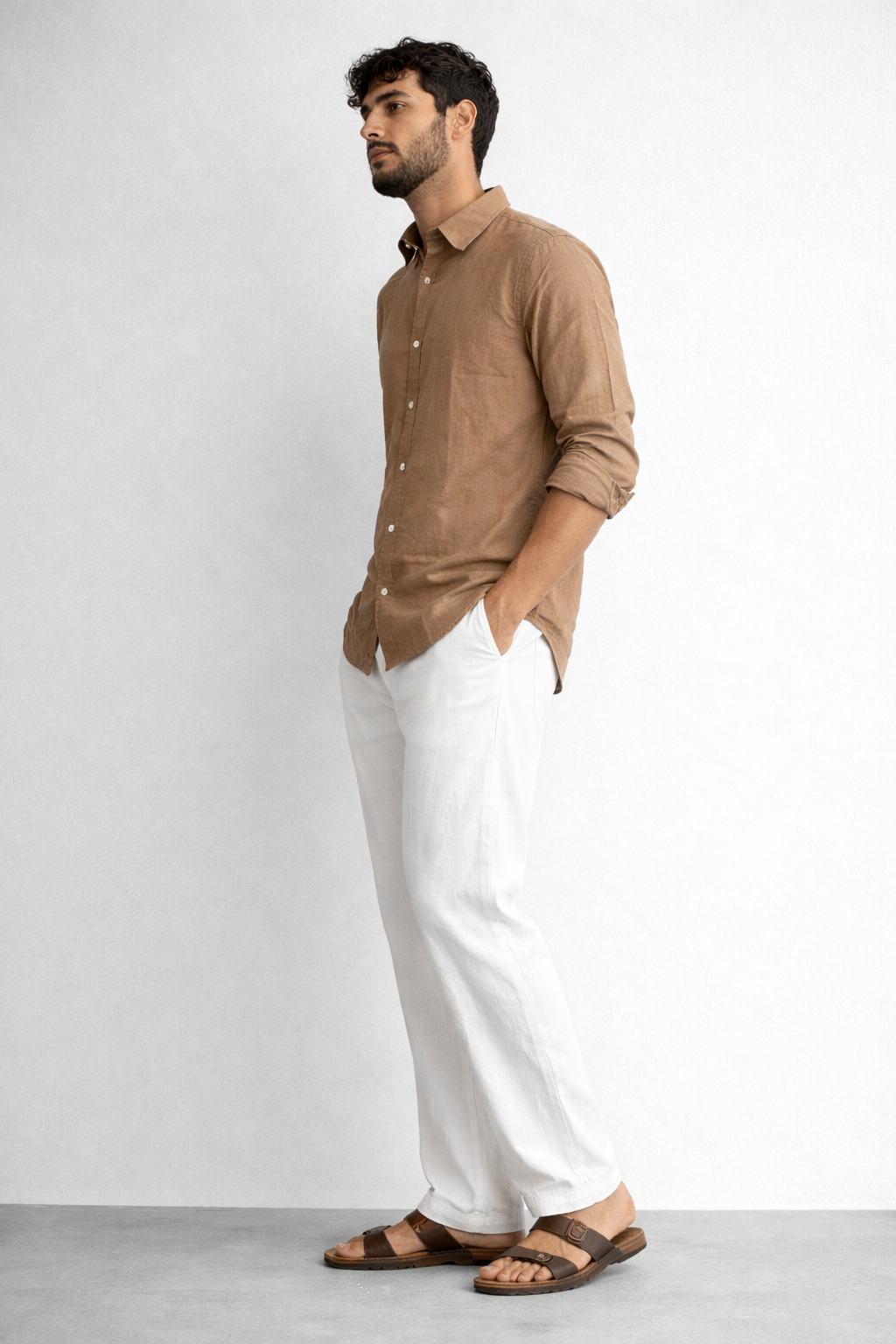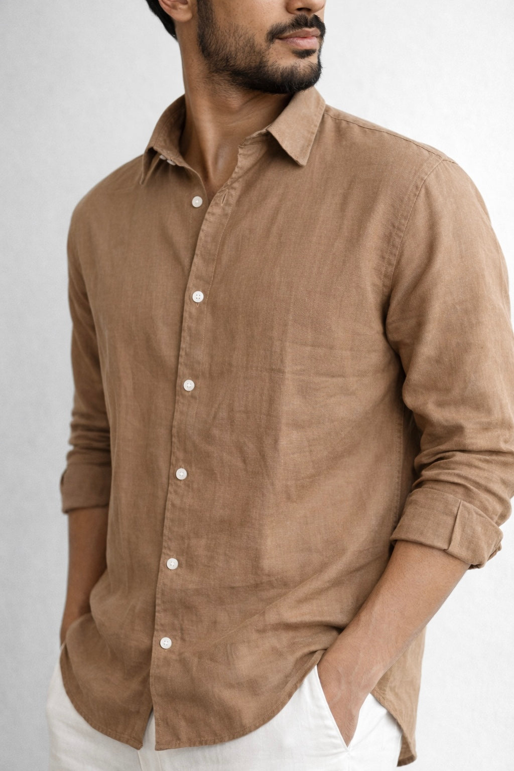 Elevate your wardrobe with the understated elegance of our Camel Linen Blend Shirt. Designed for those who value timeless style, it embodies the quiet luxury of heritage craftsmanship
