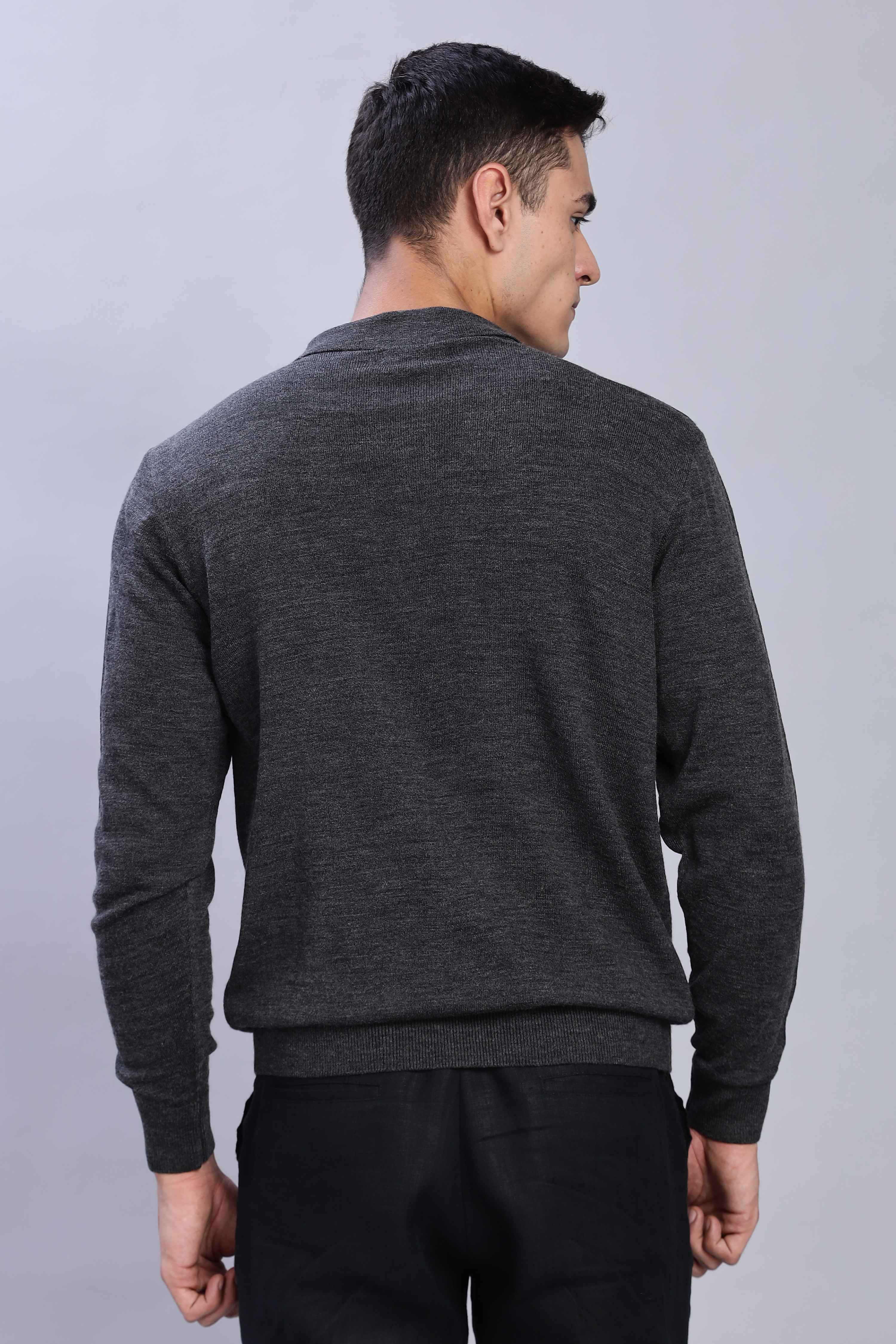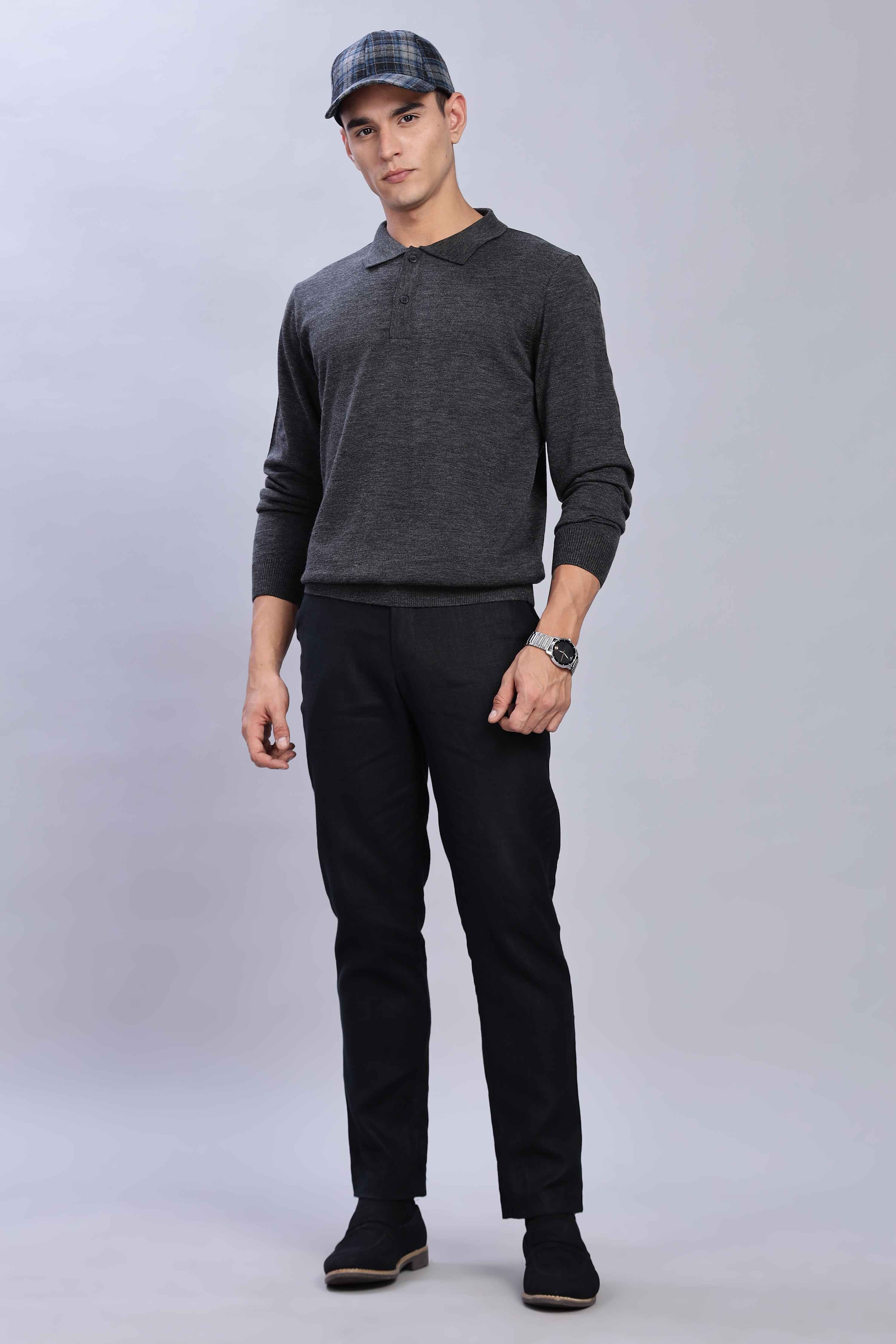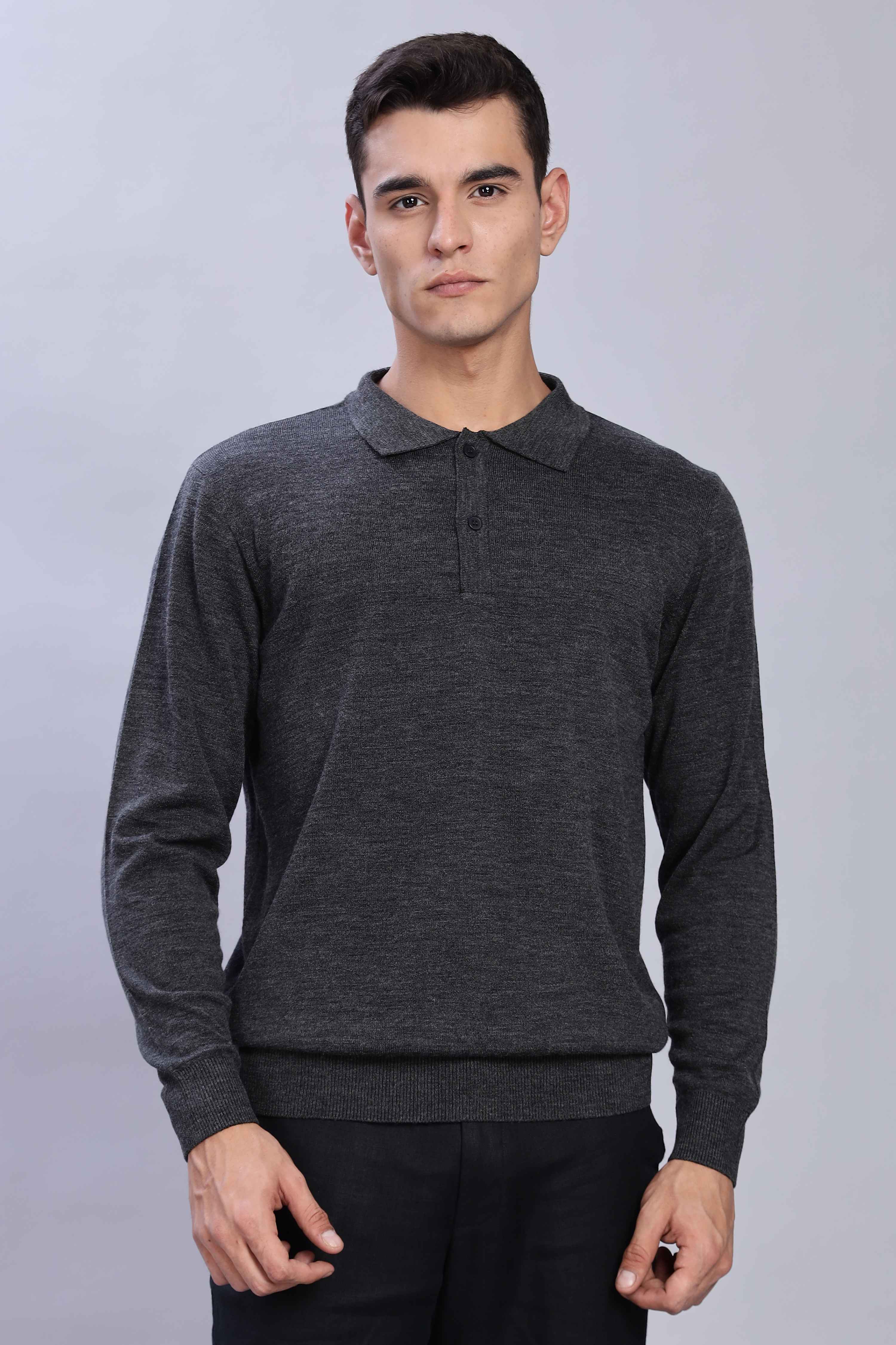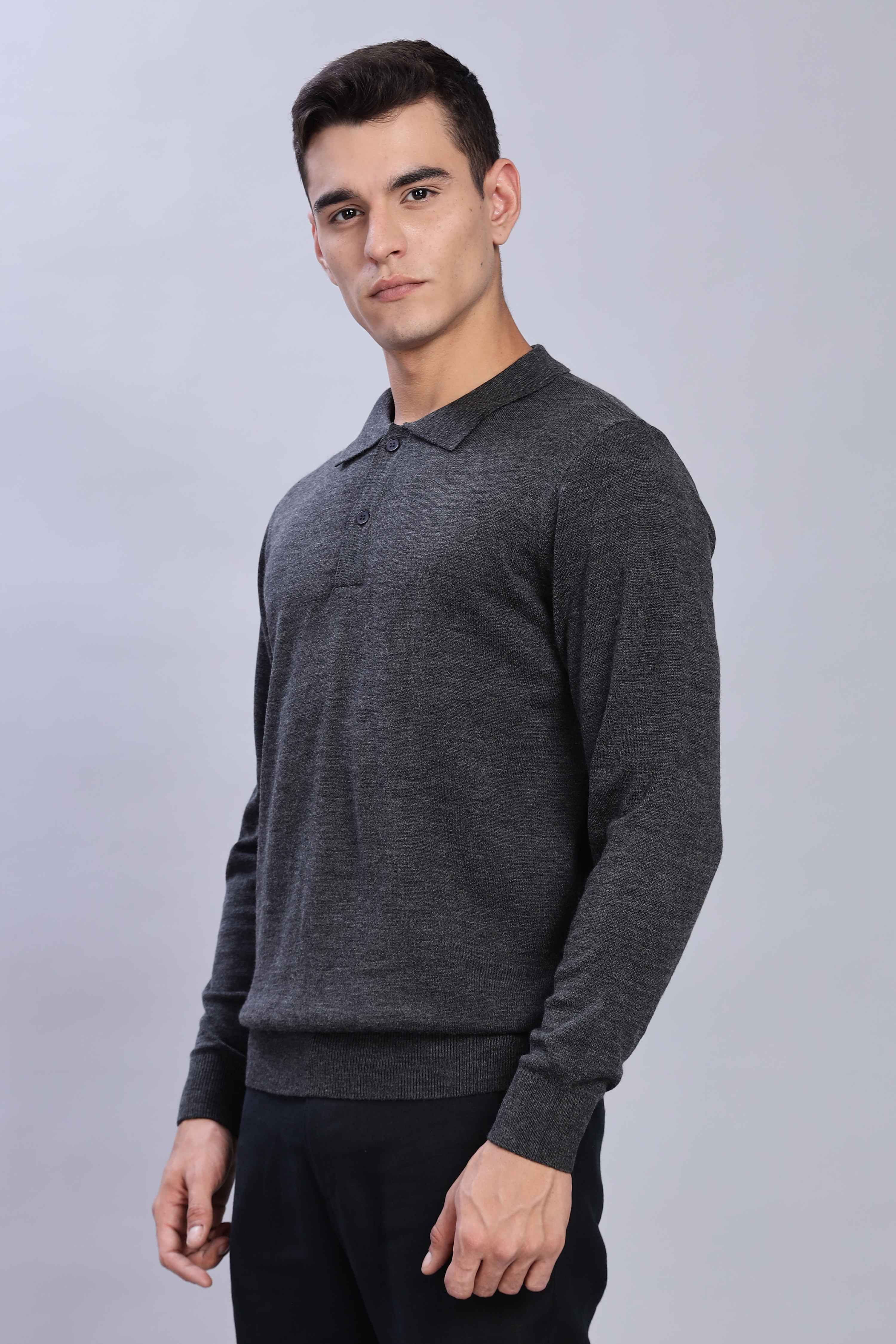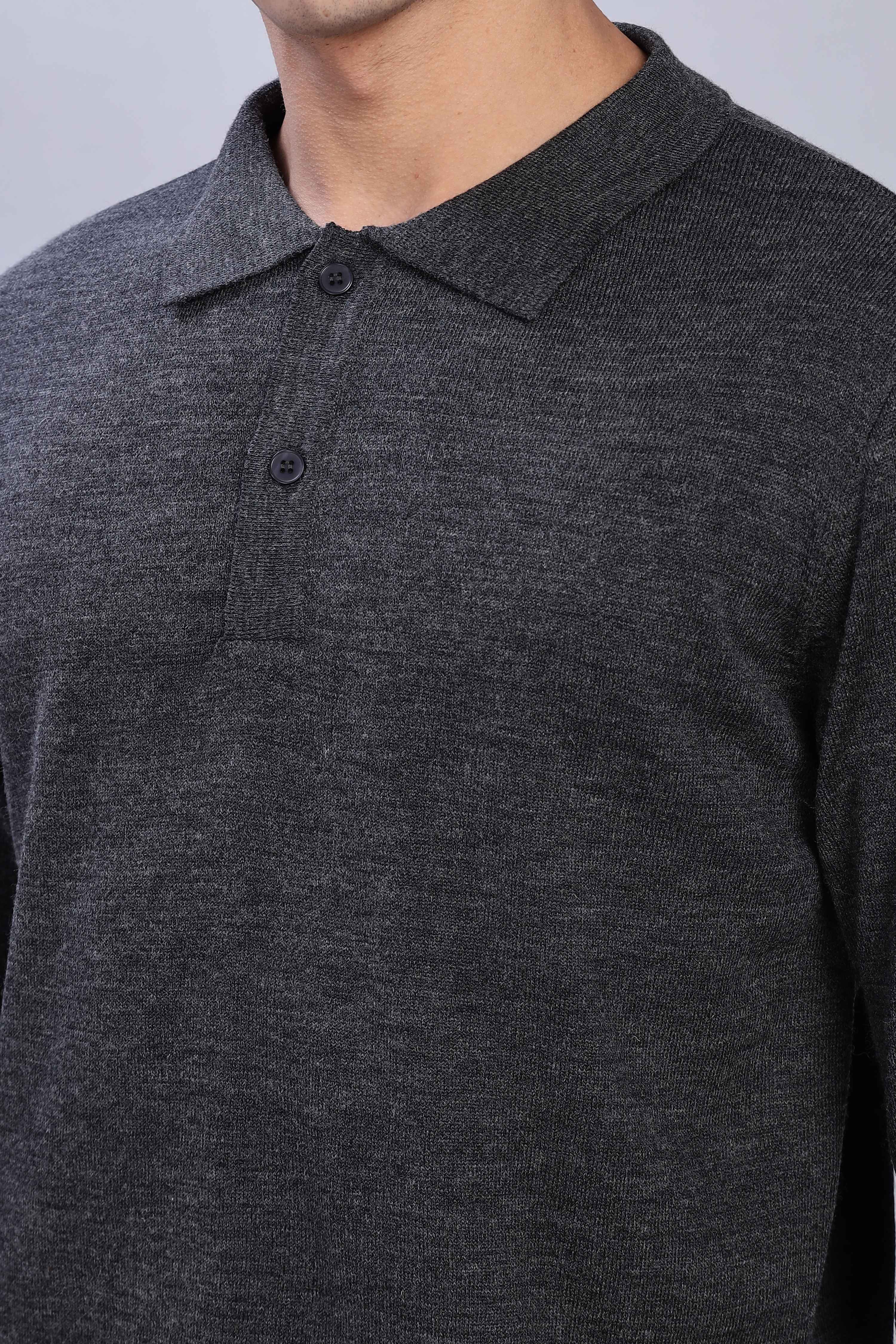 Crafted from a premium fine-knit fabric that offers both comfort and sophistication. Featuring a rich dark grey, a classic polo collar, and a sleek two-button placket, this versatile piece is perfect for layering or wearing solo