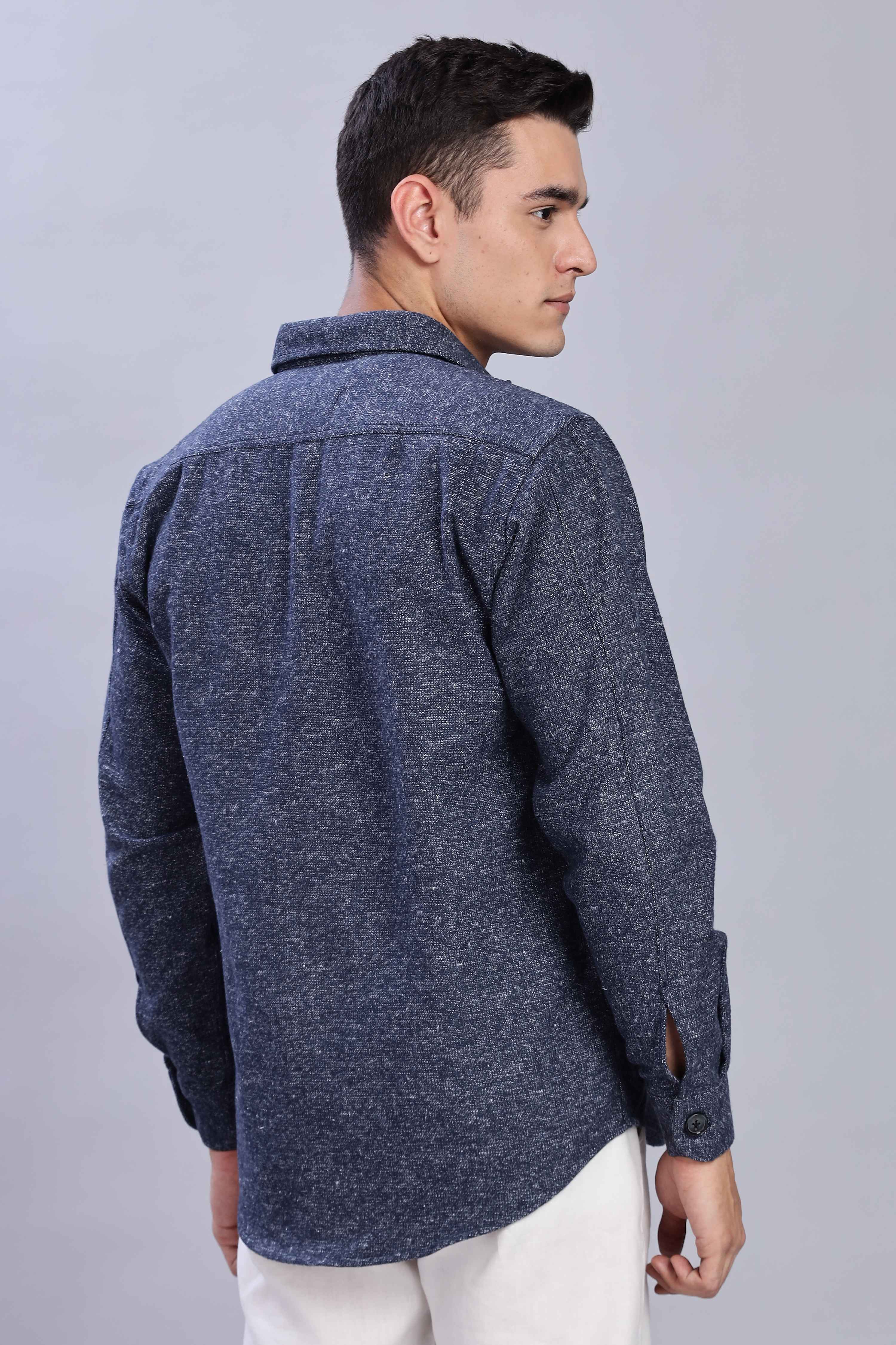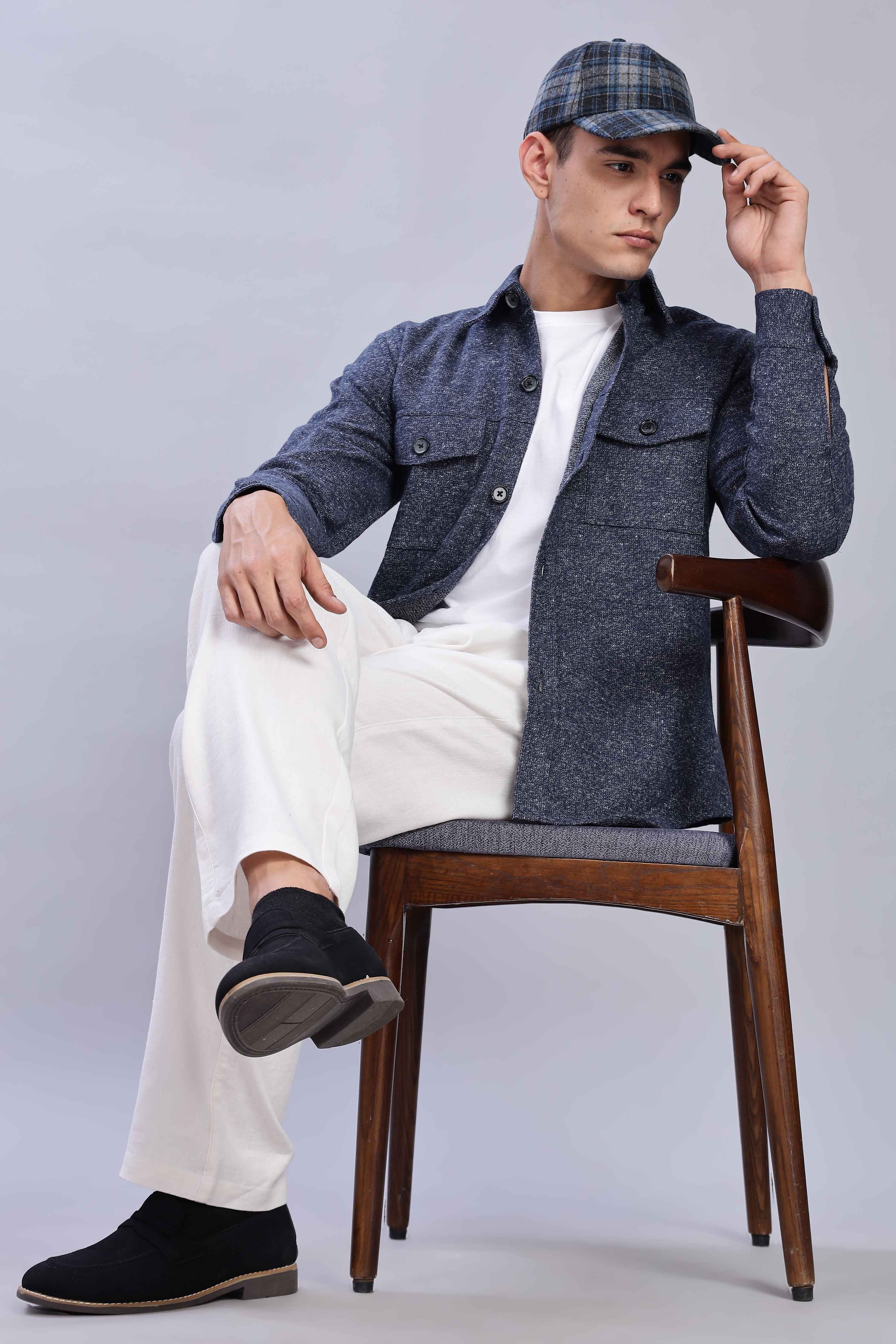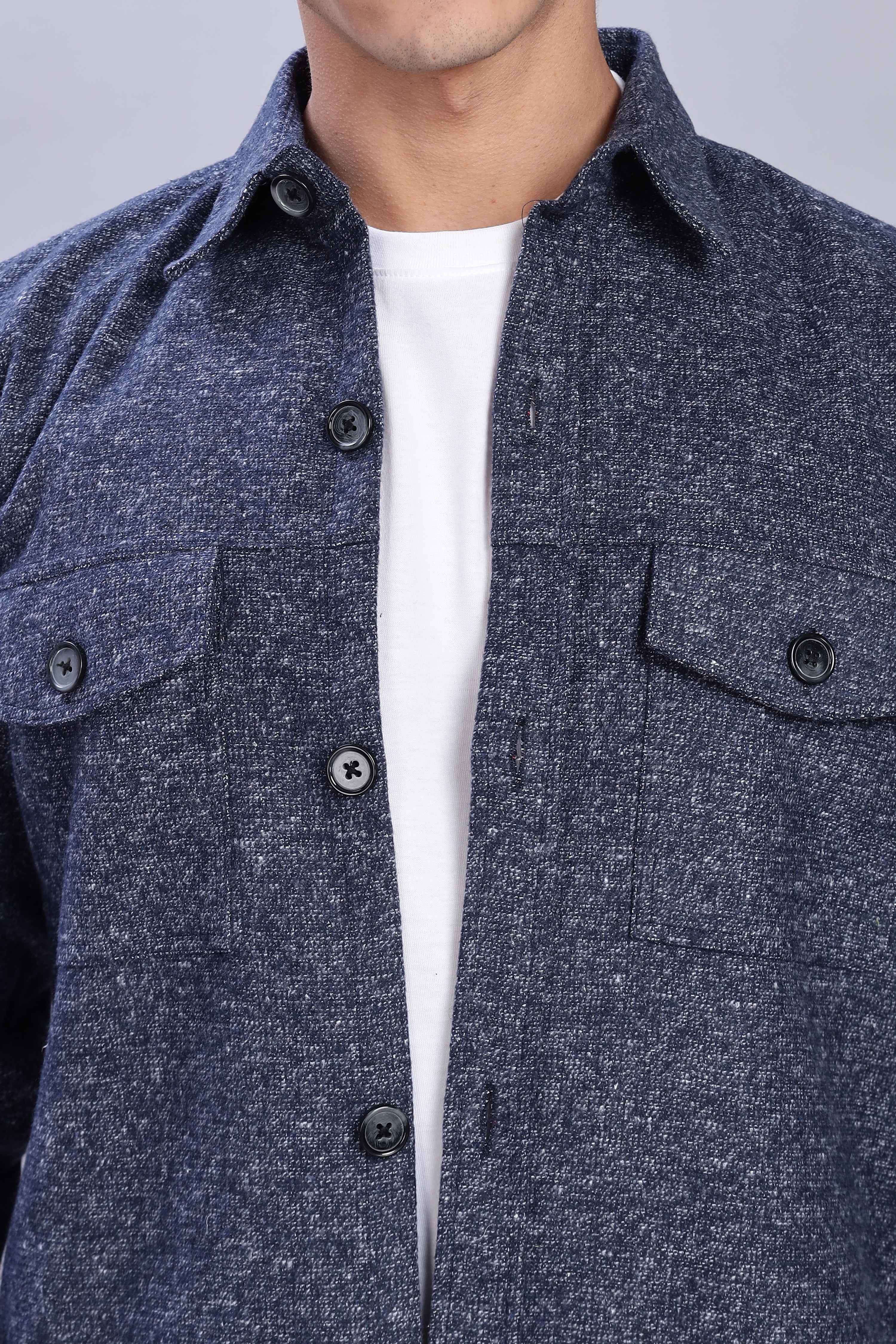 Designed for effortless layering, the Midnight Blue Overshirt blends refined style with everyday comfort. Crafted from a textured fabric with a button-up front and utility pockets, it offers a structured yet relaxed fit