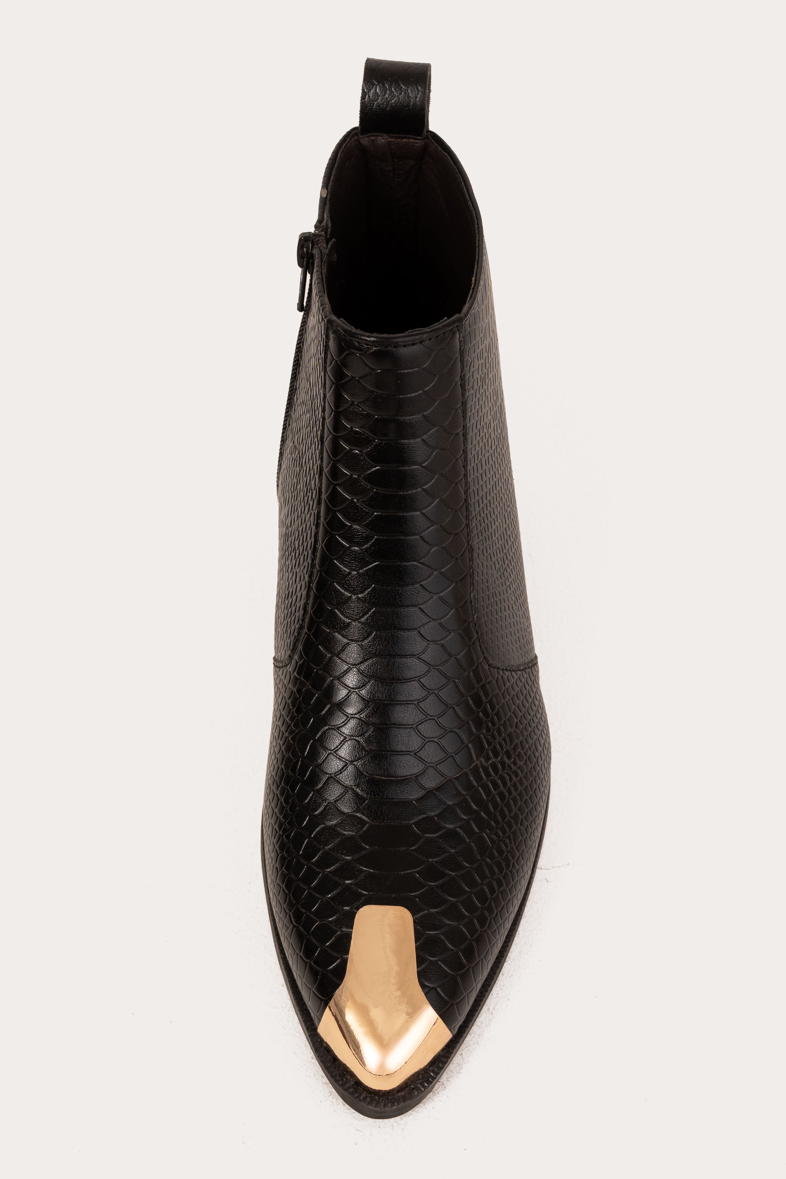 Crafted from textured, snake-inspired leather, it features a sculpted profile and a polished metal toe cap that catches the light with every step. A side zip ensures easy wear, while the sleek elastic paneling keeps the fit flexible. Confident, elevated, and built to stand out—this is a statement boot with bite.