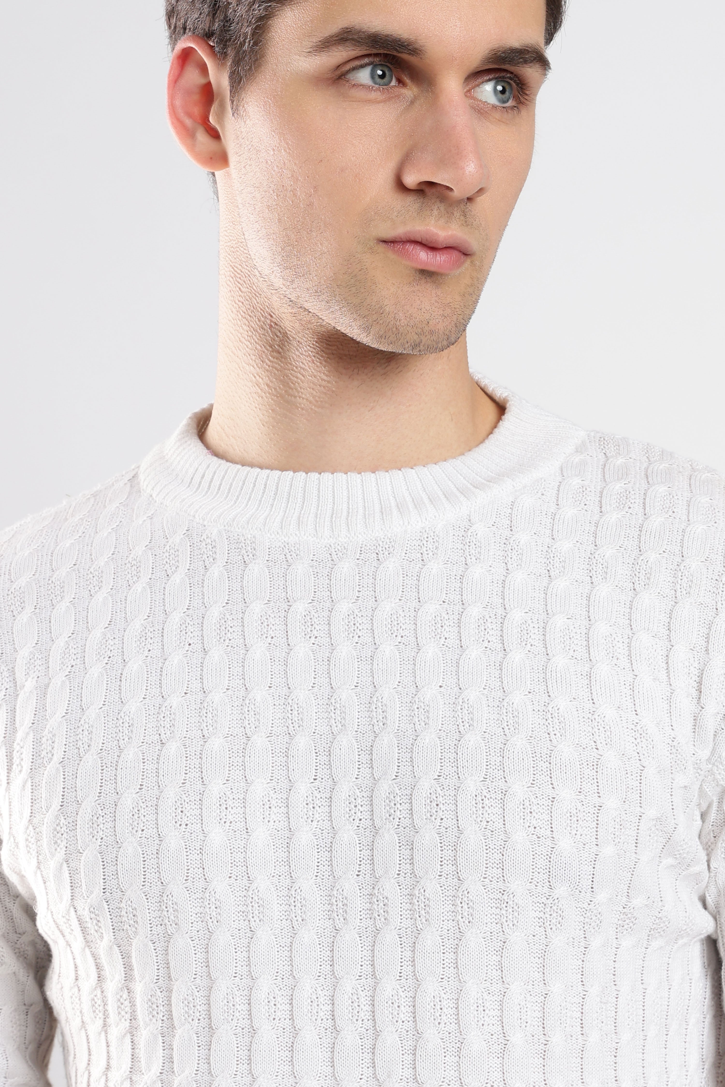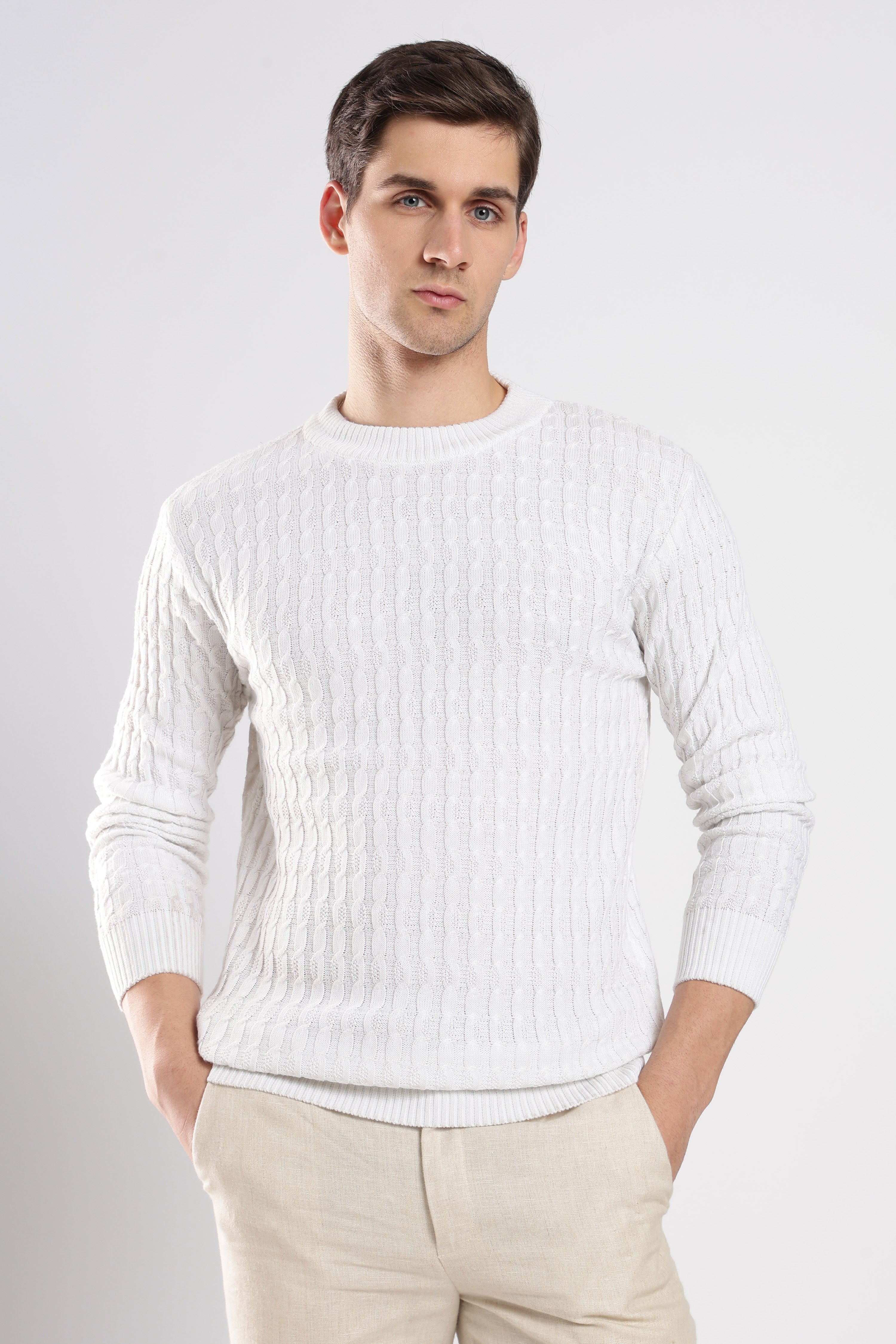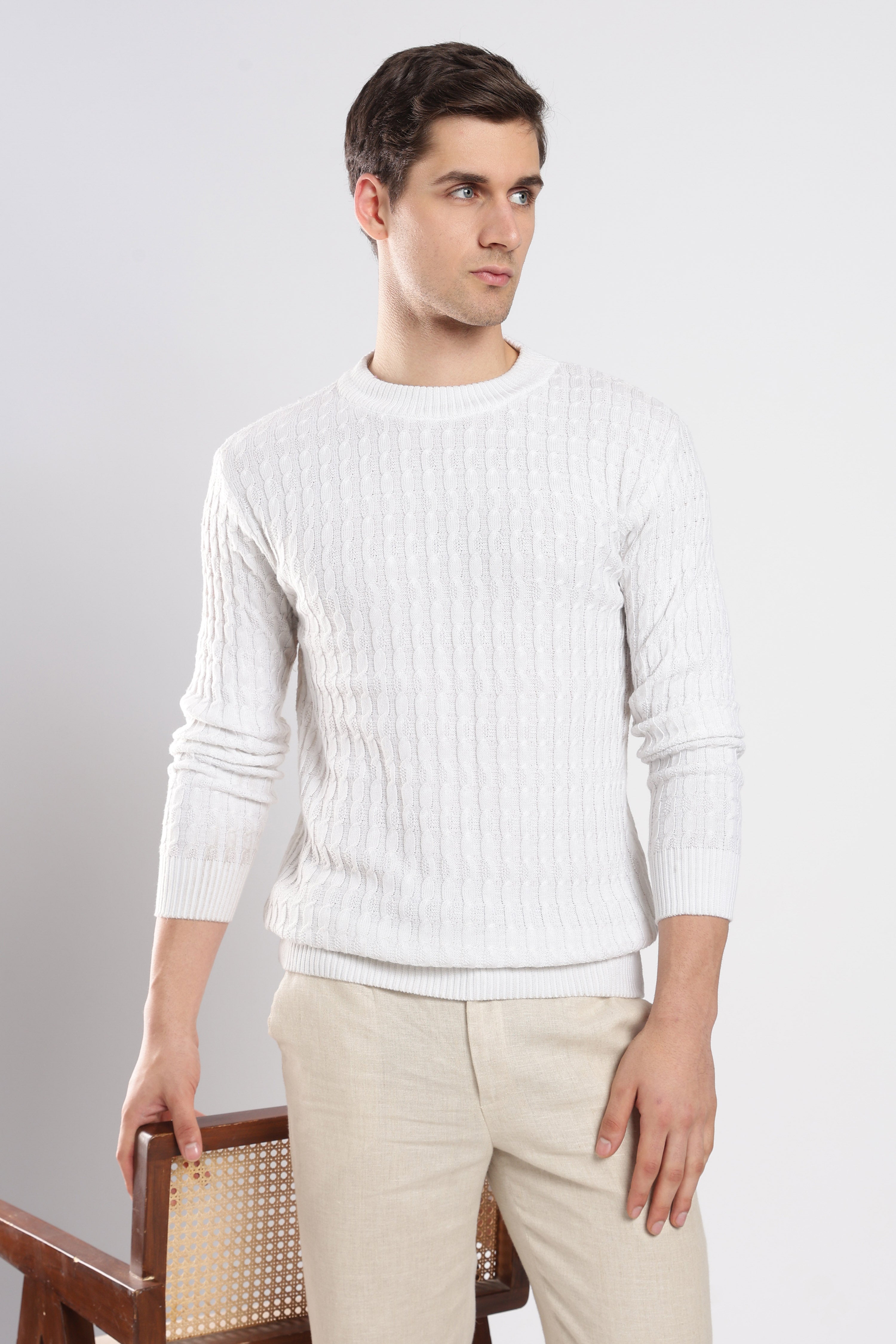 Textured white cable knit sweatshirt with a sophisticated knit design. Effortlessly stylish and comfortable for any occasion.