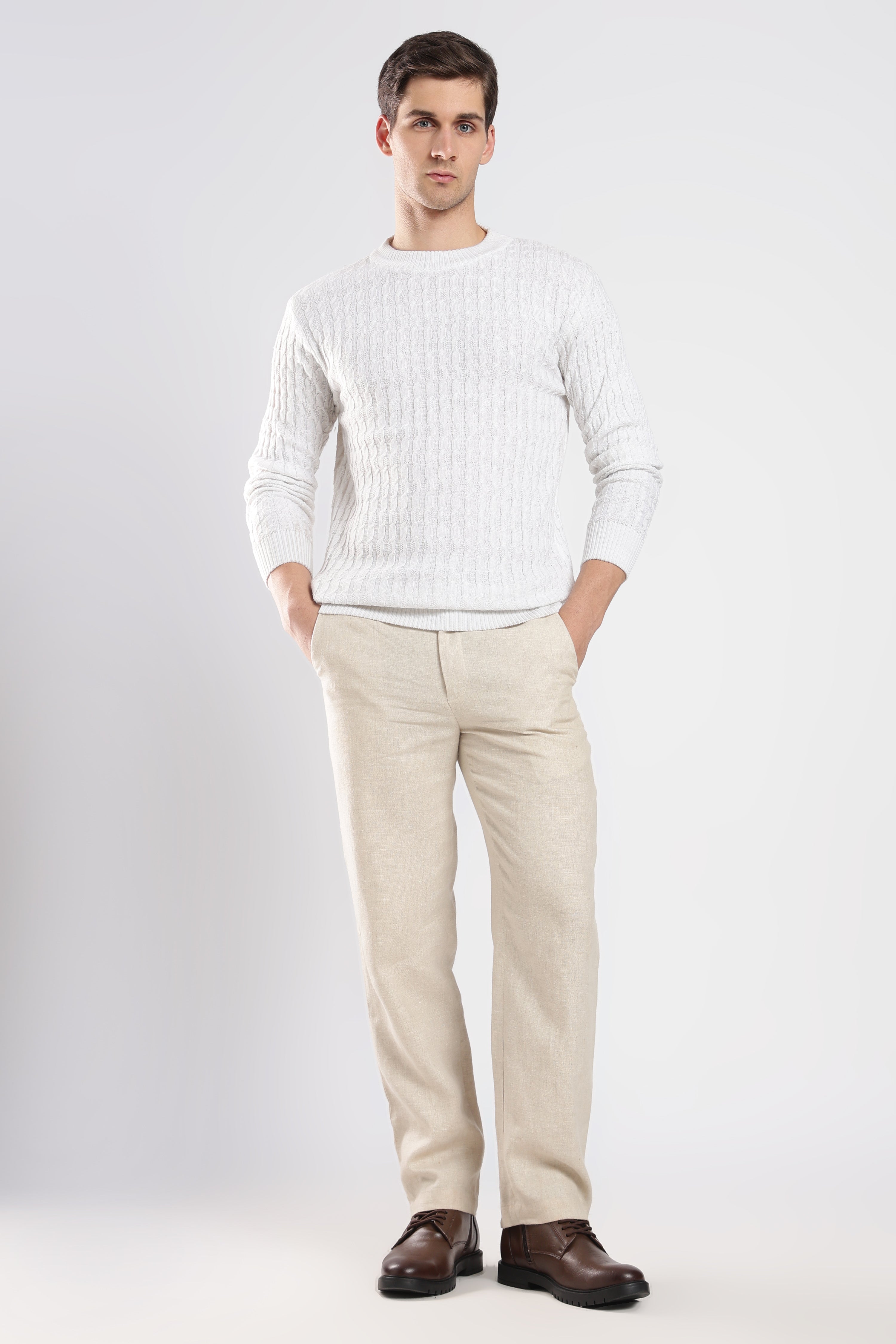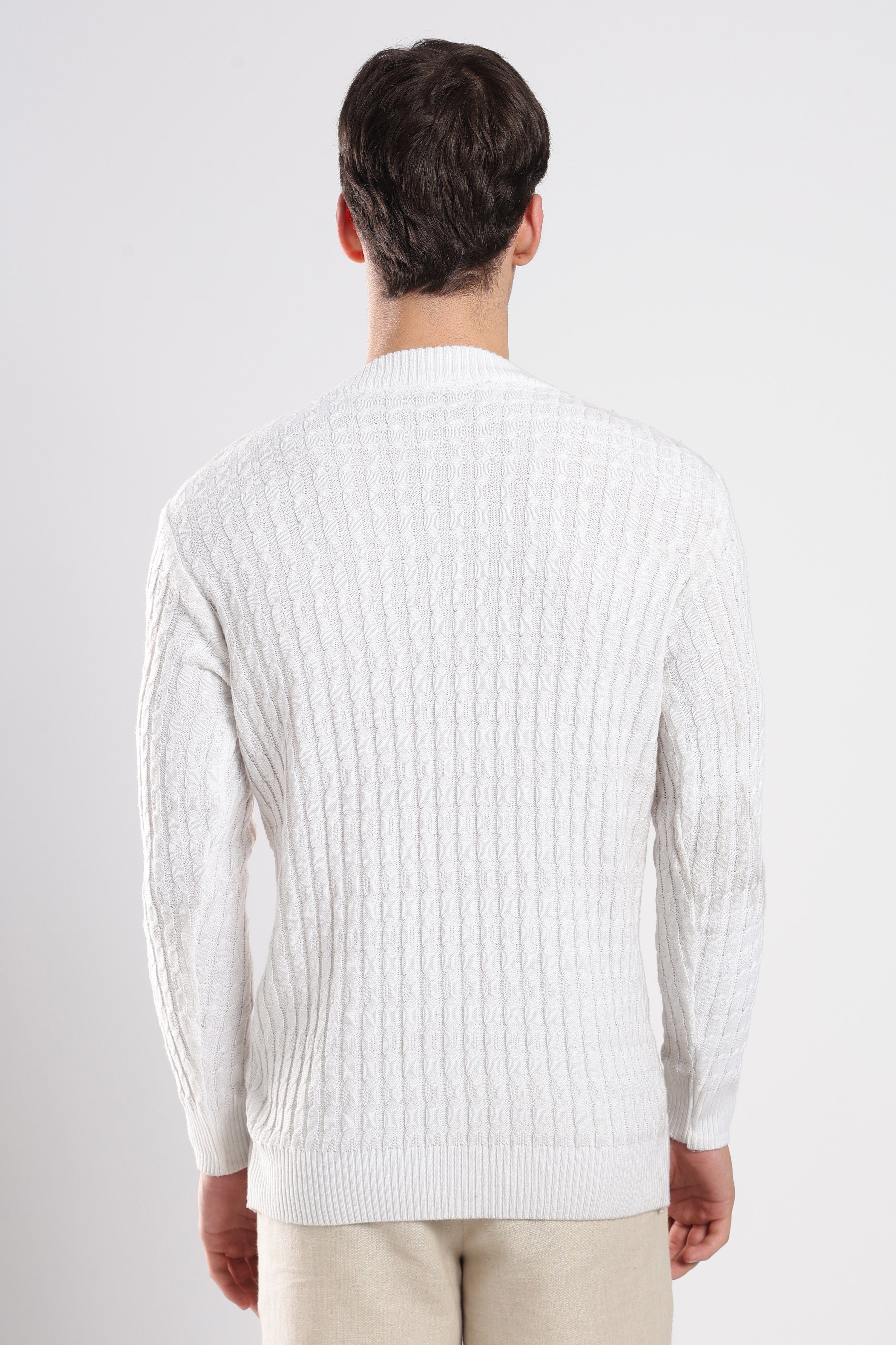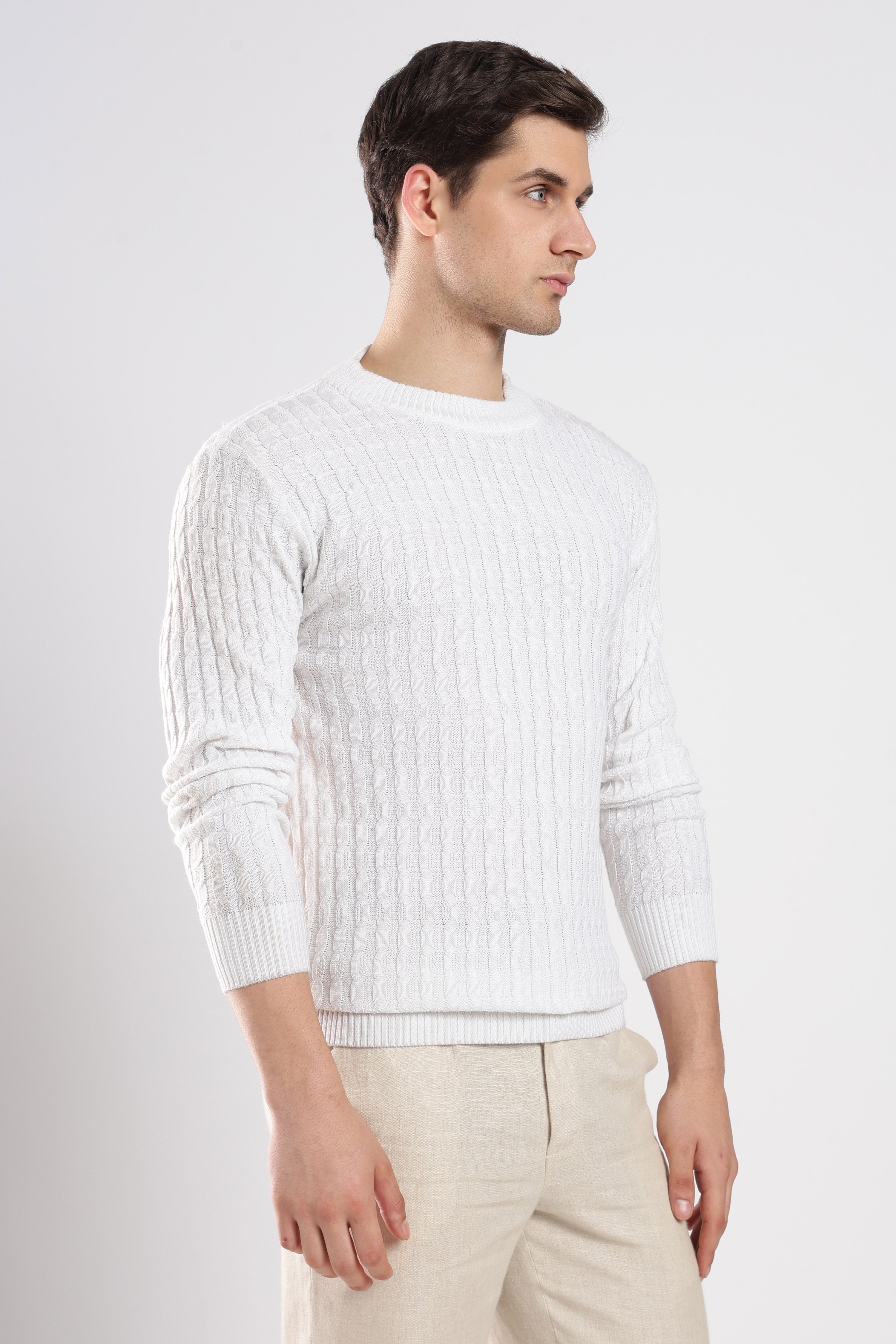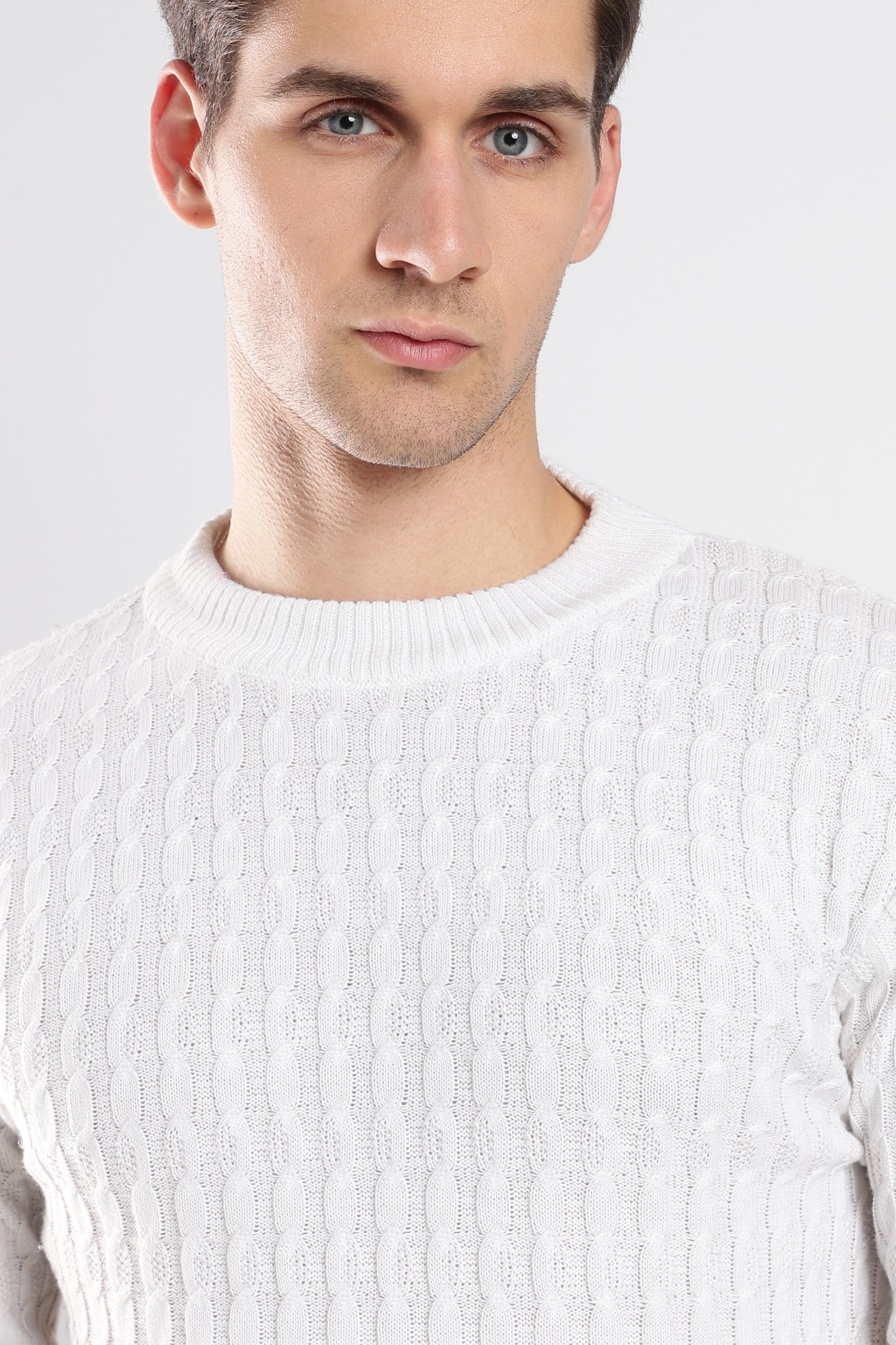 Textured white cable knit sweatshirt with a sophisticated knit design. Effortlessly stylish and comfortable for any occasion.